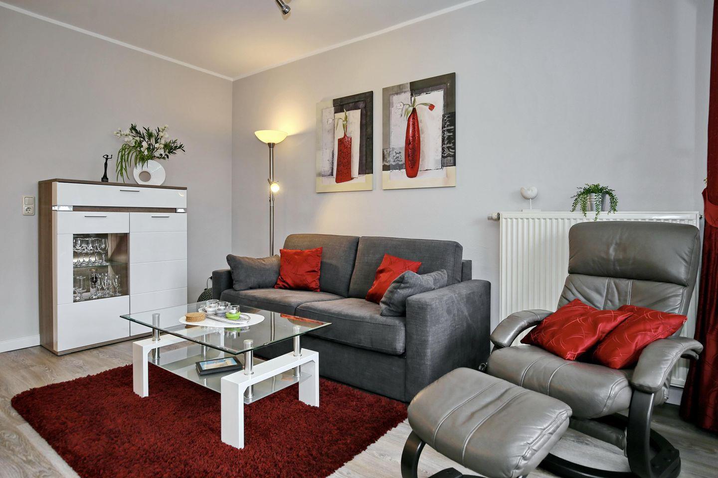 Im Wohnzimmer erwarten dich eine gemütliche Doppelschlafcouch (140 x 190 cm), ein Fernsehsessel sowie ein Flatscreen-TV. Neben einem Blu-Ray-Player steht dir ein kostenloser WLAN-Zugang (ohne Gewähr) zur Verfügung.