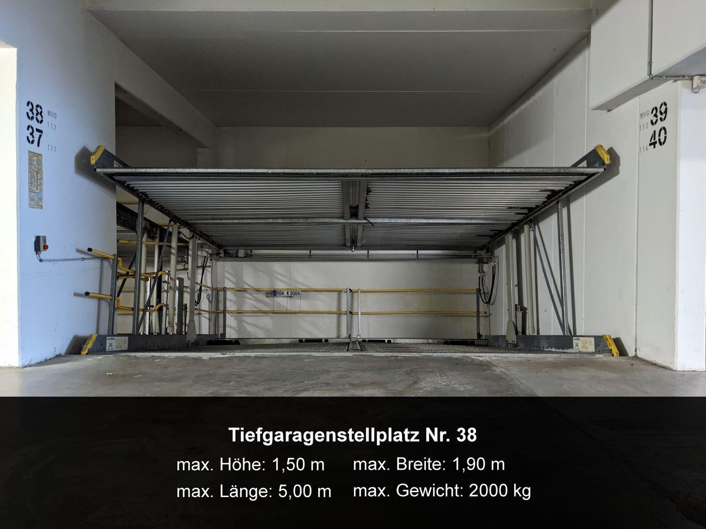 Zu der Wohnung gehört der Kfz-Stellplatz Nr. 38 in der Tiefgarage (max. Höhe 1,50 m, max. Gewicht 2.000 kg).
