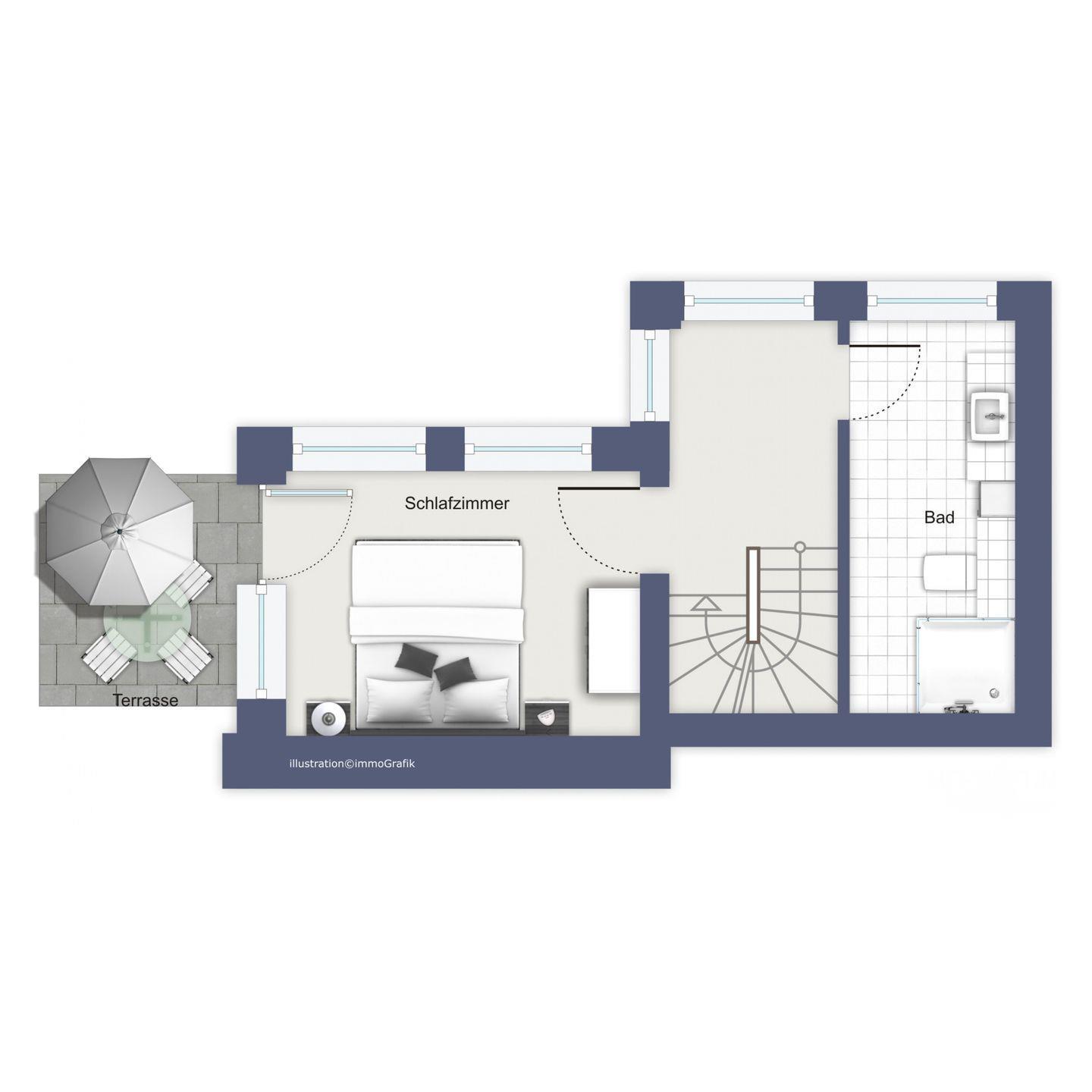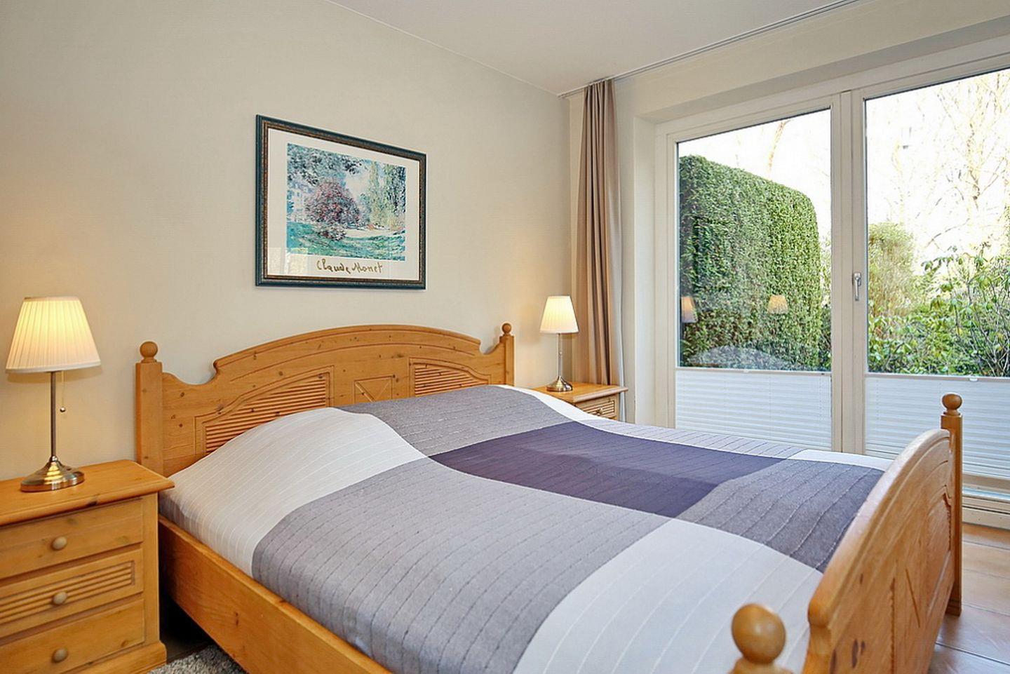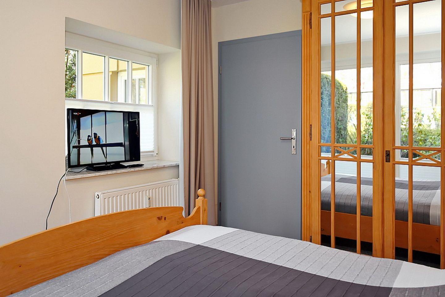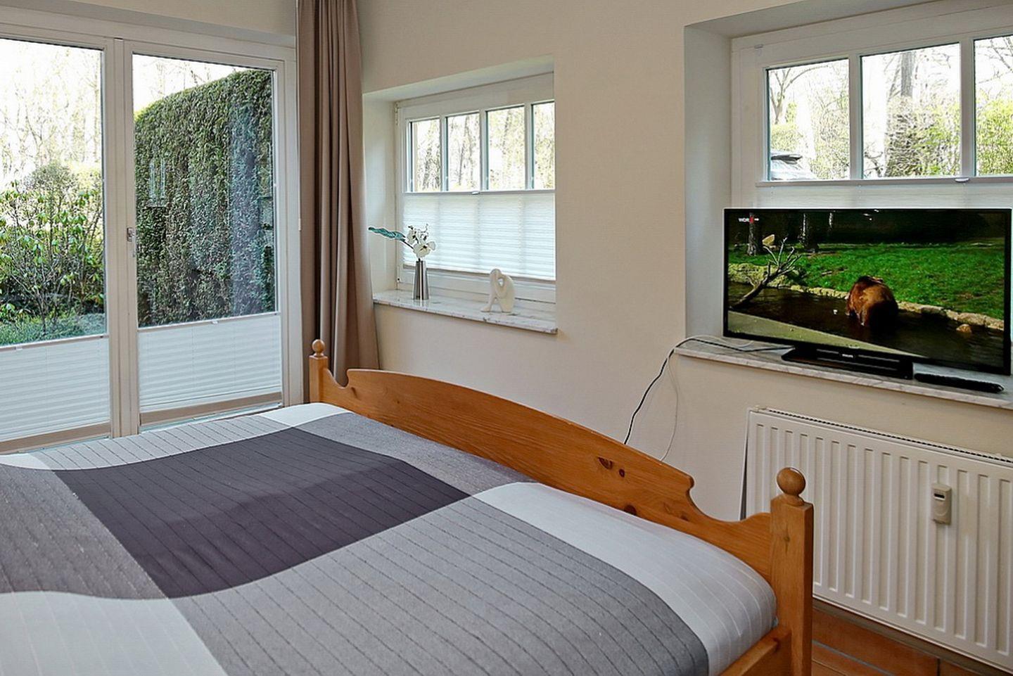 Das Schlafzimmer befindet sich im Untergeschoss und verfügt über ein großes Doppelbett (2 x 90 x 200 cm), einen Flachbild-TV und einen großen Kleiderschrank. Von hier aus gelangst du auf die Terrasse.