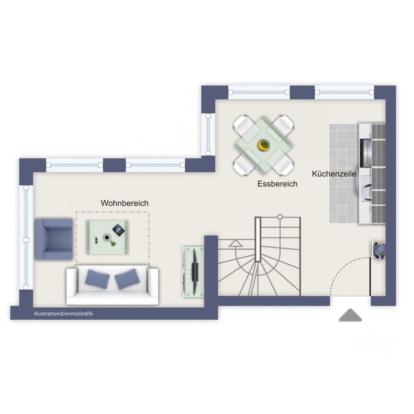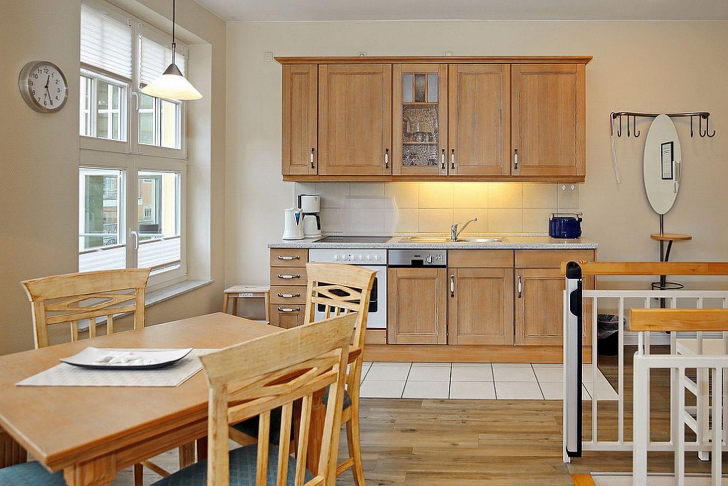 Die im Wohnbereich integrierte Küchenzeile verfügt über ein 4-Zonen-Cerankochfeld mit Backofen und einen Geschirrspüler. Ebenso stehen dir Kaffeemaschine, Wasserkocher und Toaster zur Verfügung.