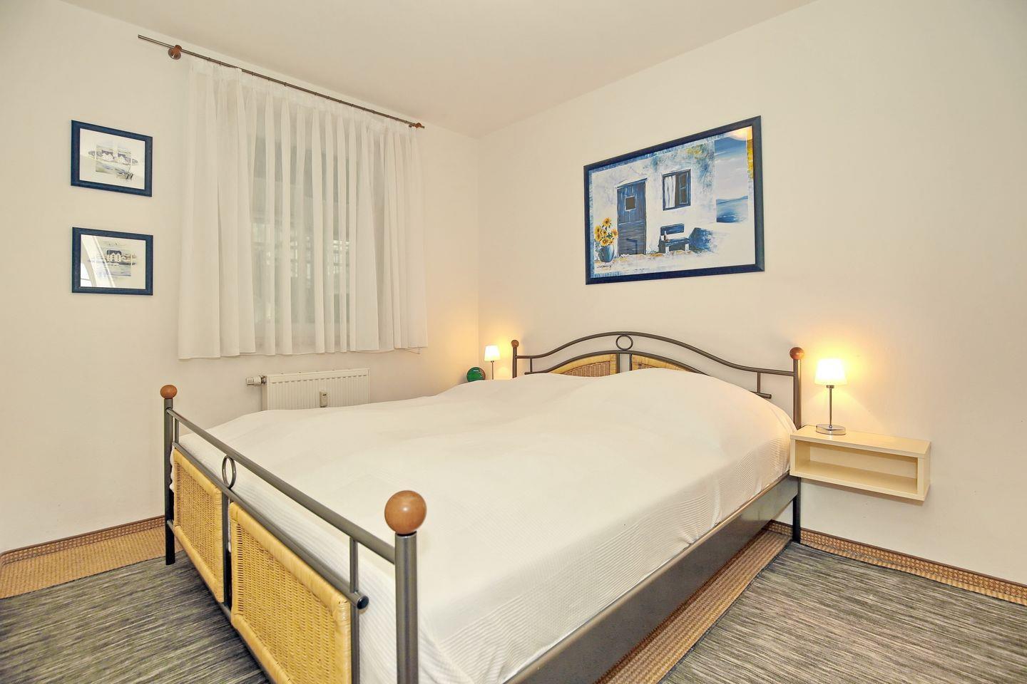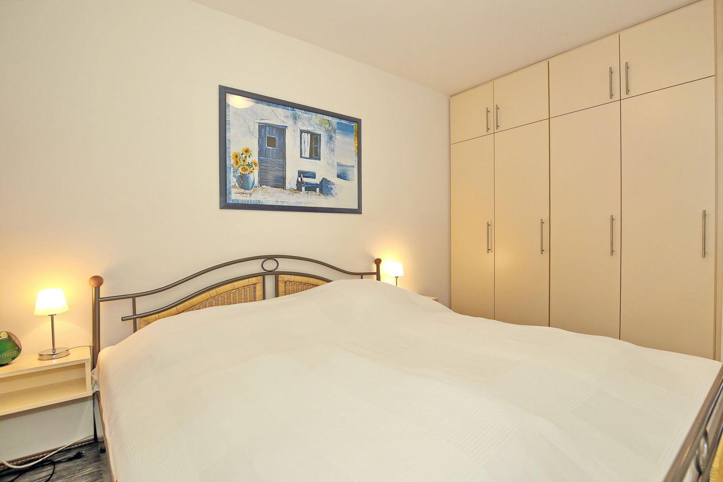 Im Schlafzimmer dieser Ferienwohnung lädt ein Doppelbett (2 x 90 x 200 cm) zum erholsamen Schlaf ein. Ein großer Kleiderschrank bietet viel Stauraum. (Das Schlafzimmerfenster geht zum Atrium raus)