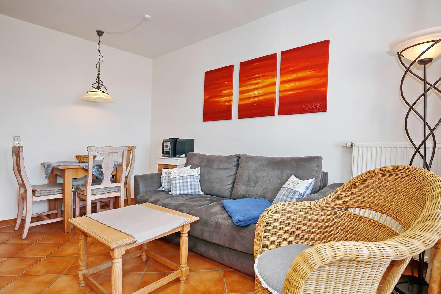 Im Wohnraum der Ferienwohnung lädt eine gemütliche Doppelschlafcouch (140 x 200 cm) sowie ein Flachbild-TV, ein DVD-Player und ein Radio mit CD-Player zu erholsamen Urlaubstagen ein.