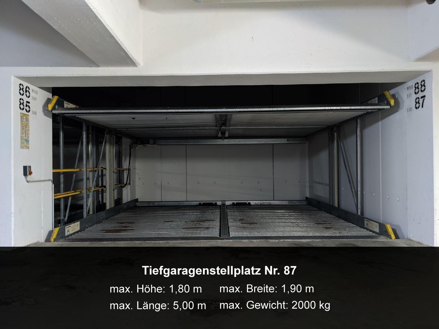 Zur Ferienwohnung gehört der Kfz-Stellplatz Nr. 87 in der Tiefgarage (max. Höhe 1,80 m, max. Gewicht 2.000 kg).
