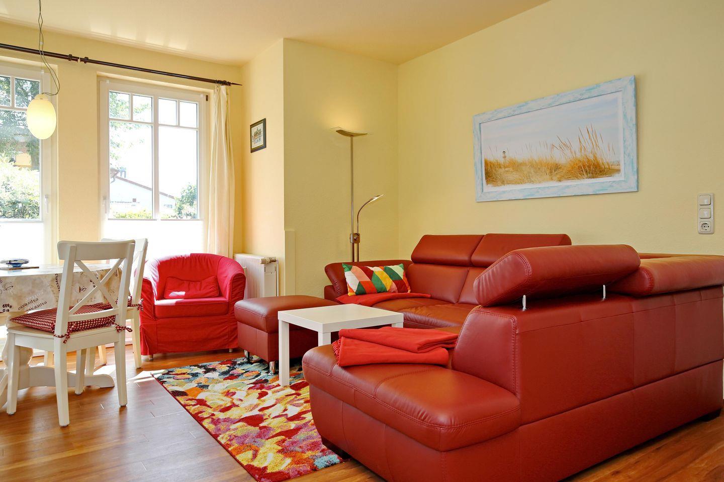 Entspanne in der Ferienwohnung auf der Ledercouch mit großzügiger Ottomane. Zur Unterhaltung und für Abwechslung sorgen der Flachbild-TV, eine Stereoanlage sowie ein Blu-ray-Player. WLAN steht dir zur kostenfreien Nutzung zur Verfügung.