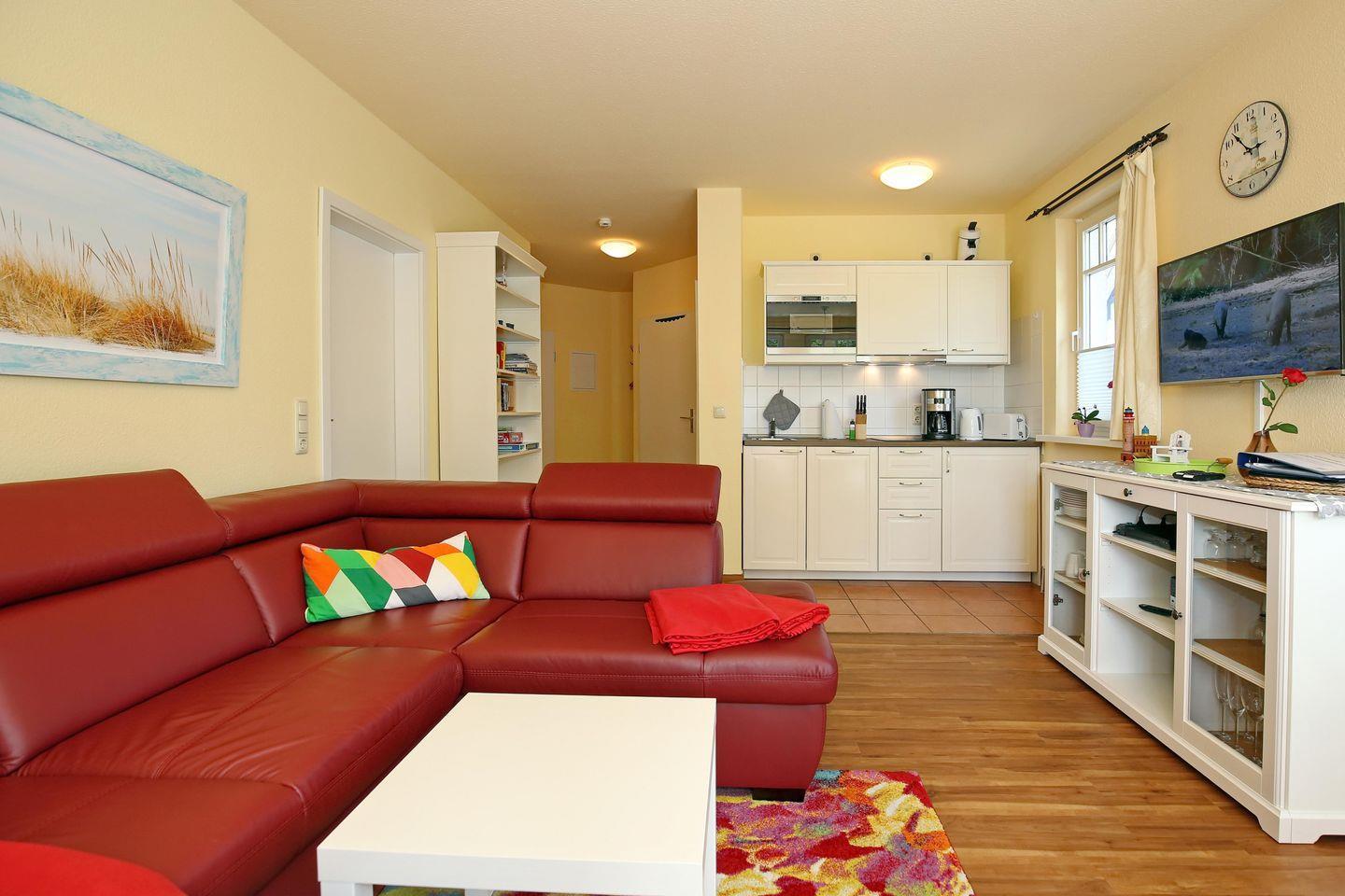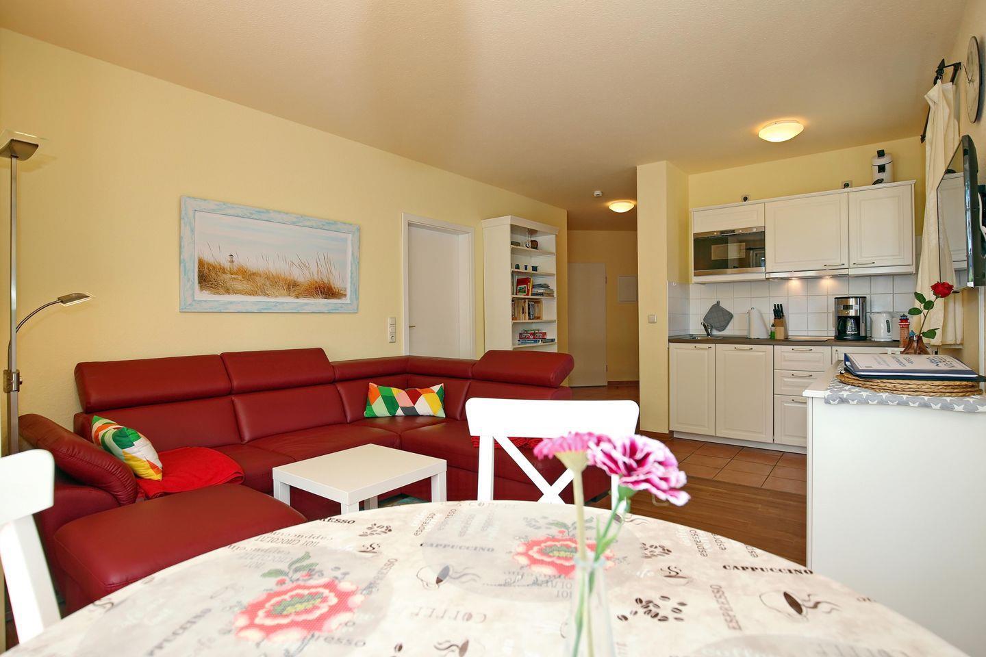 Die im Wohnraum integrierte Küchenzeile beinhaltet ein 2-Platten-Cerankochfeld, einen Mini-Backofen, eine Mikrowelle, einen Geschirrspüler, einen Kühlschrank mit Gefrierfach sowie natürlich Wasserkocher, Kaffeemaschine und Toaster. Zusätzlich kannst du die Senseo-Kaffeepadmaschine nutzen. Am angrenzenden Esstisch haben 4 Personen Platz.