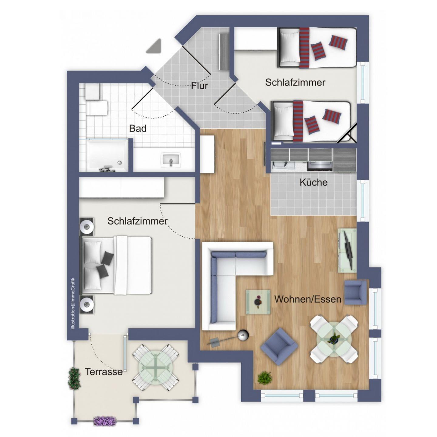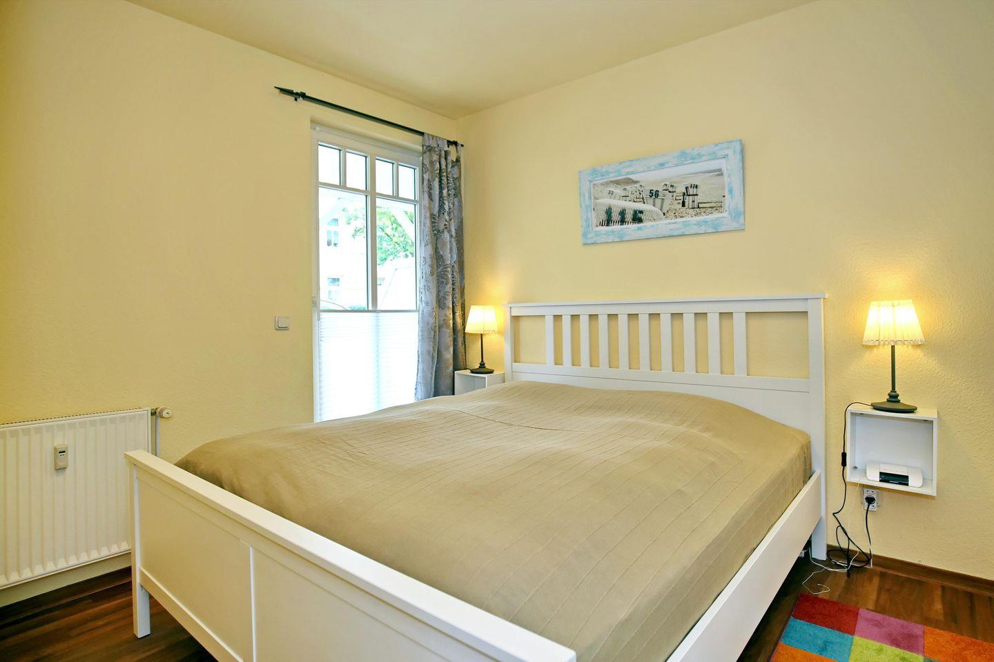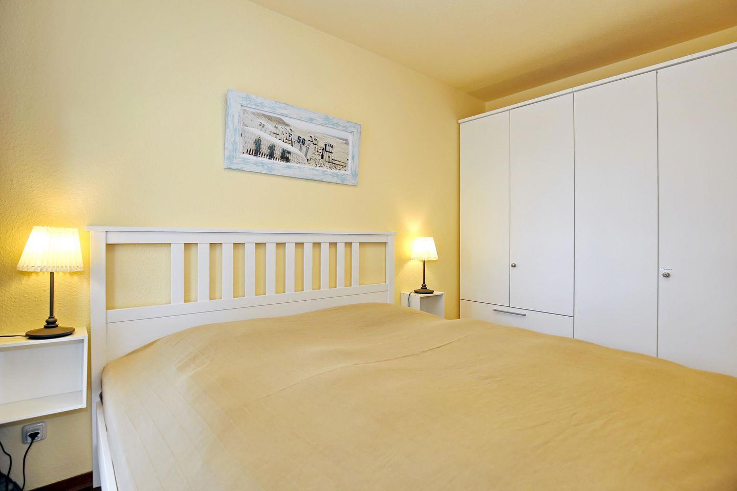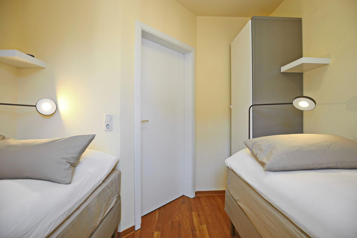 Als komfortable Rückzugsmöglichkeit dienen die beiden Schlafzimmer. Im ersten Schlafzimmer erwarten dich ein großes Doppelbett (180 x 200 cm), ein Kleiderschrank und ein Flachbild-TV. Das zweite Schlafzimmer verfügt über 2 Boxspring-Einzelbetten (90 x 200 cm), einen Kleiderschrank und einen Flachbild-TV. Plissees an den Fenstern dienen dem Sichtschutz.