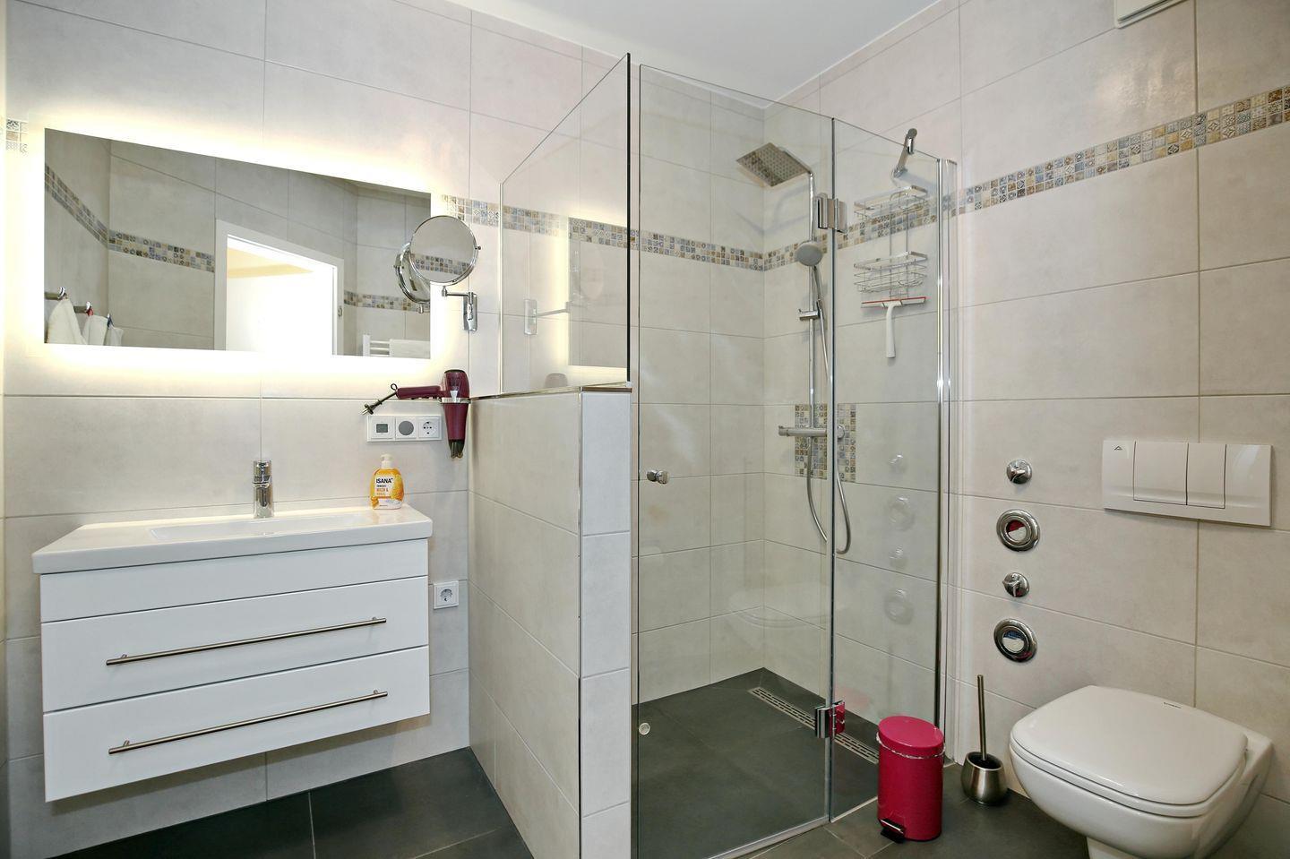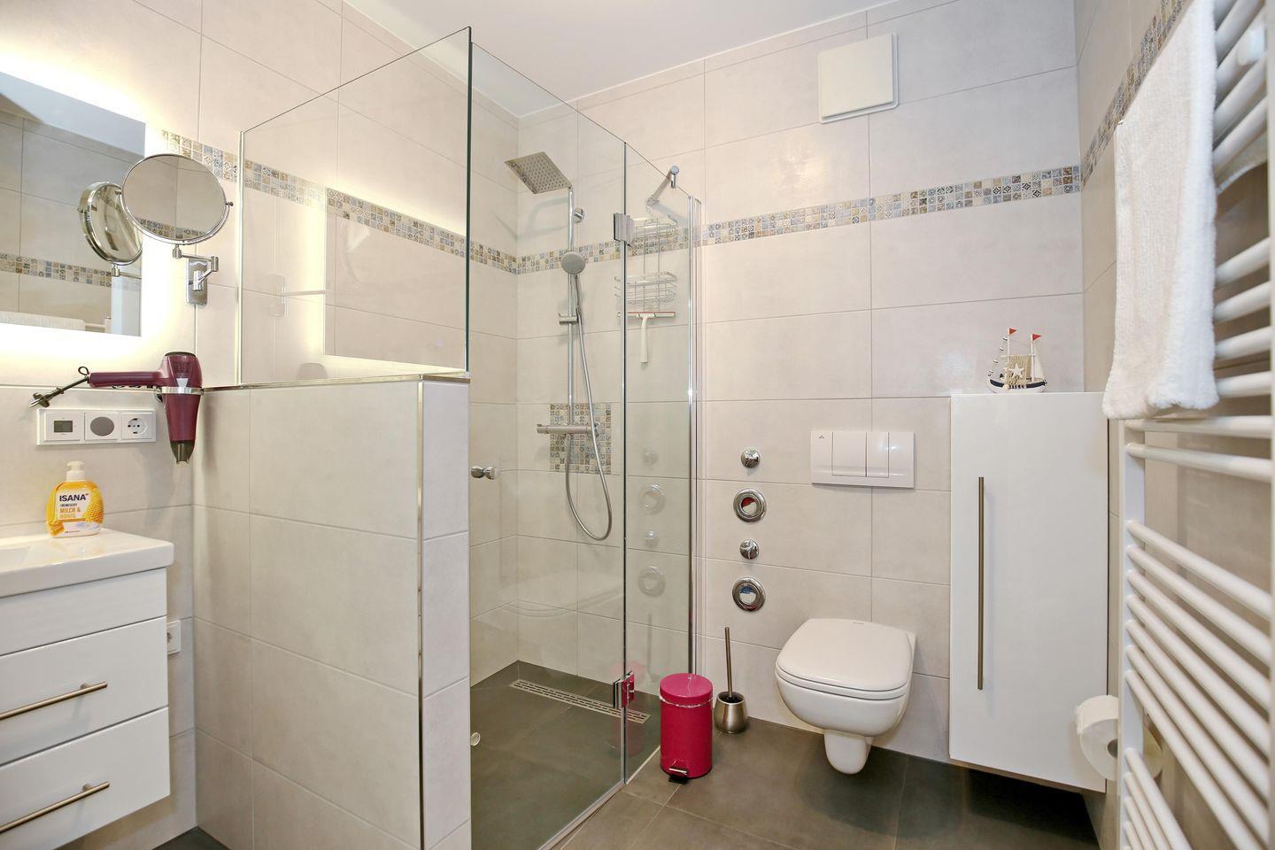 Die Ferienwohnung verfügt selbstverständlich auch über ein hochwertiges Badezimmer mit einer ebenerdigen Regendusche (120 x 90 cm), einem WC, einem Waschbecken, einem Fön, einem Kosmetikspiegel und zur Unterhaltung findest du auch ein integriertes Badezimmerradio vor.