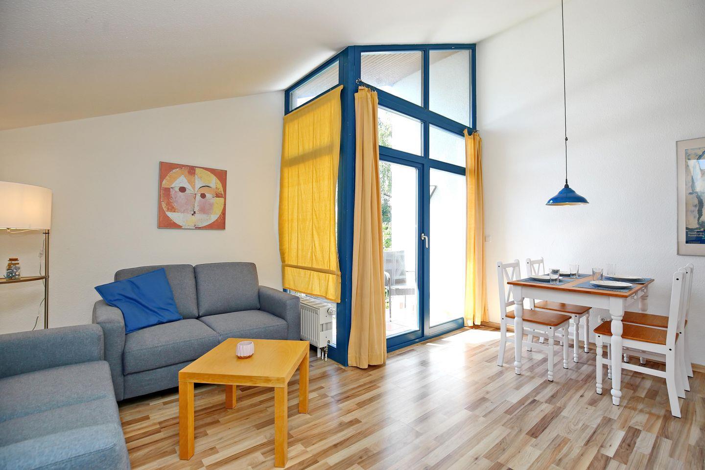 Der Wohnbereich der Ferienwohnung ist für dich mit einem Sofa, einem Flachbild-TV sowie einem Radio mit CD-Player ausgestattet und verspricht dir gemütliche Abendstunden. Das hauseigene WLAN nutzt du kostenlos. Der integrierte Essbereich bietet dir mit einem Tisch und 4 Stühlen genügend Platz für deine gemeinsamen Mahlzeiten.