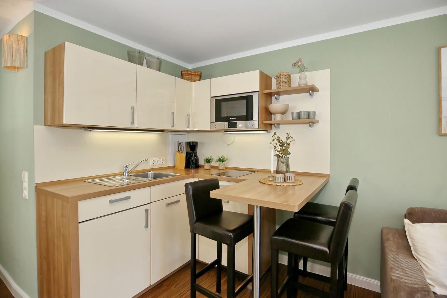 Der gemütliche Wohnbereich der Ferienwohnung lädt mit einer Couch, zwei Sesseln, einem Flatscreen-TV und einer Stereoanlage mit Dockingstation zu geselligen Abenden ein. Den WLAN-Anschluss der Wohnung kannst du kostenlos nutzen. Der integrierte Essbereich ist als Tresen das Verbindungsstück zwischen dem Wohnbereich und der Küche. Hier hast du ausreichend Platz für gemeinsame Mahlzeiten.