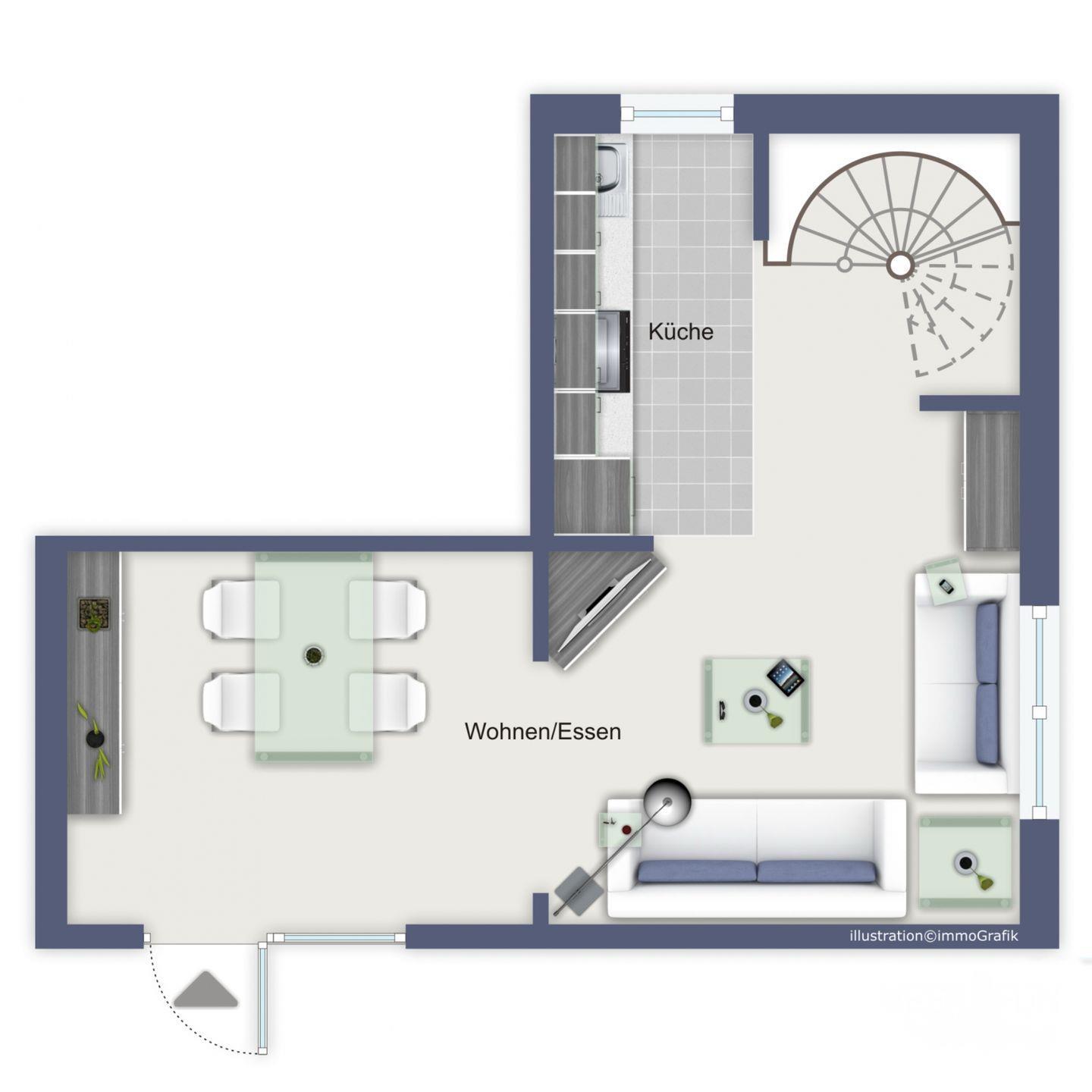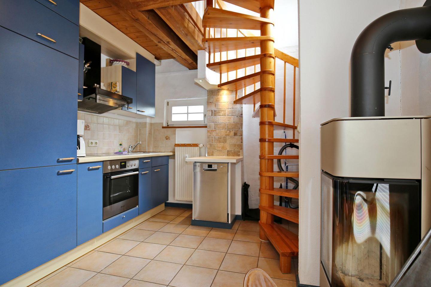 Der Wohnbereich der Ferienwohnung liegt im Erdgeschoss und ist mit einer gemütlichen ausziehbaren Schlafcouch (120 x 200 cm) und zwei Sesseln, sowie einer Blu-ray-Anlage und einem Flachbild-TV ausgestattet. Im Wohnbereich befindet sich auch ein Kaminofen. Durch ein großes Südfenster wird der Wohn-und Essbereich lichtdurchflutet und der anschließende Essbereich lädt zu gemeinsamen Mahlzeiten ein.
