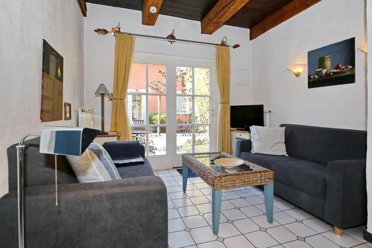 Der Wohnbereich der Ferienwohnung lädt mit zwei Couchen zu geselligen Abenden ein. Zur Unterhaltung stehen ein Flachbild-TV und eine Stereoanlage für dich bereit. Der angrenzende Essbereich bietet 4 Personen viel Platz für gemütliche Mahlzeiten.