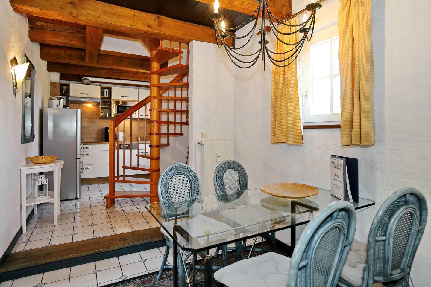 Die offene und freundlich helle Küche der Ferienwohnung verfügt über ein 4-Platten-Cerankochfeld, eine Mikrowelle mit Grillfunktion, einen kleinen Backofen, einen Geschirrspüler und eine Kühl-Gefrierkombination mit drei Tiefkühlfächern. Ein Toaster, eine Kaffeemaschine sowie ein Wasserkocher komplettieren die Ausstattung der Küche.