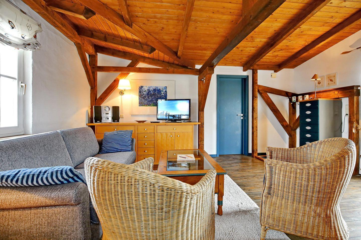 Der Wohnbereich der Ferienwohnung verspricht mit einer Couch, zwei Korbsesseln und einem Flachbild-TV gesellige Stunden. Eine Kommode kannst du zum Verstauen deiner persönlichen Sachen nutzen. Die hölzerne Decke mit den sichtbaren Dachbalken, die sich durch die gesamte Wohnung zieht, sorgt für Gemütlichkeit. Der Essbereich bietet 4 Personen viel Platz für das gemeinsame Essen.