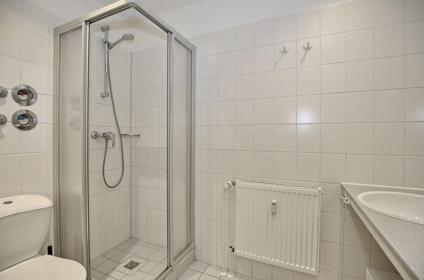 Das Bad der Ferienwohnung mit Dusche und WC verfügt über einen durchgängigen Doppelwaschtisch mit Ablagefläche. Ein großer Spiegel sowie ein kleines Regal vervollständigen die Ausstattung. Der Wohn- und Essbereich, die Küche und das Bad sind gefliest. Im Schlafzimmer ist Laminat verlegt.