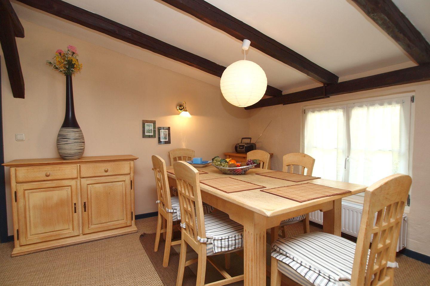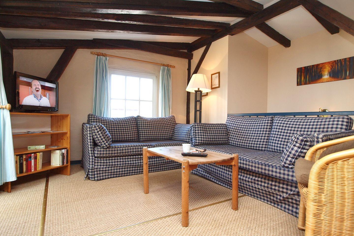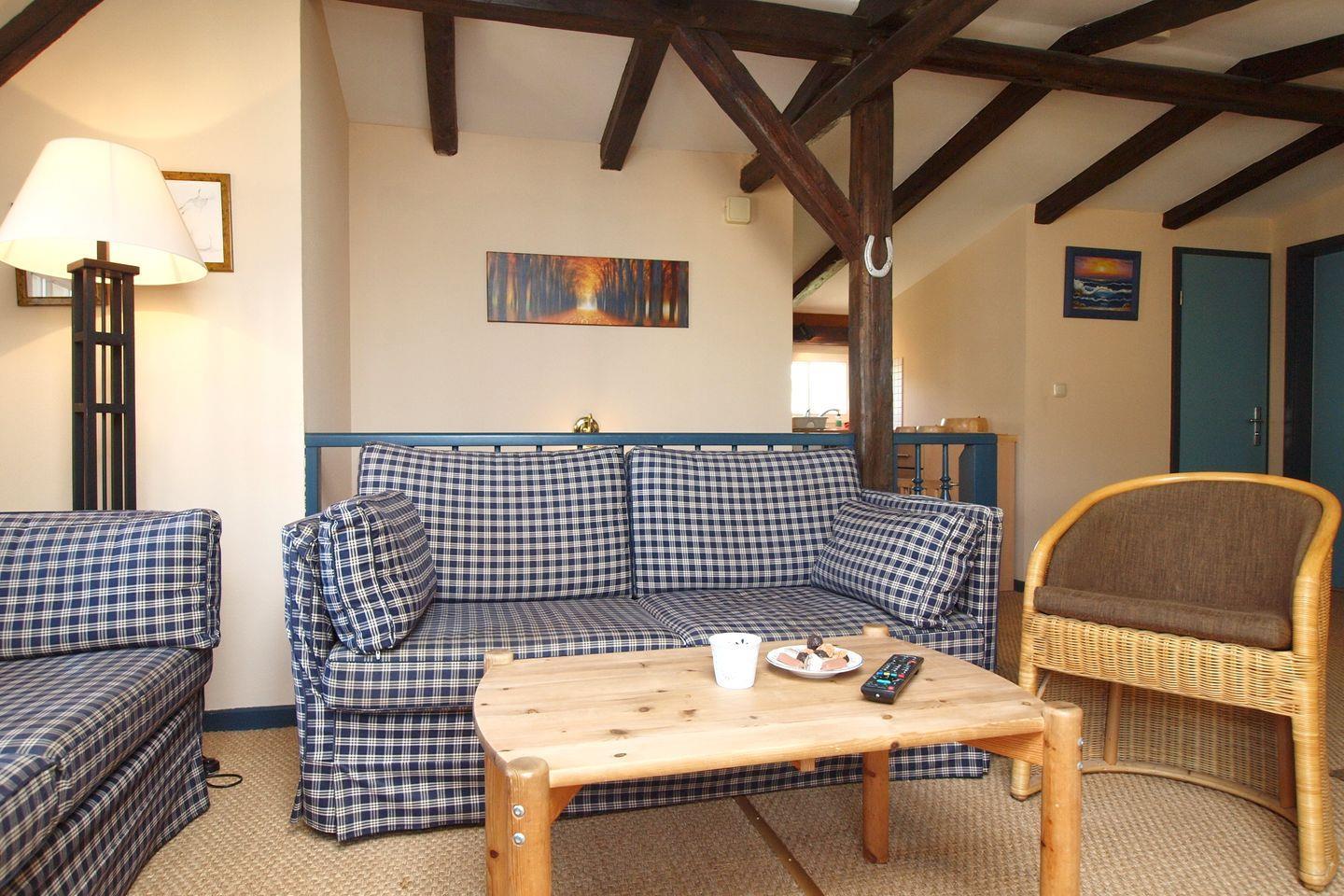 Der Wohnbereich der Ferienwohnung ist mit einer gemütlichen Sitzecke, einem Flachbild-TV, einem Radio und zwei Kommoden eingerichtet. Der integrierte und großzügige Essbereich bietet dir viel Platz für gemeinsame Mahlzeiten.