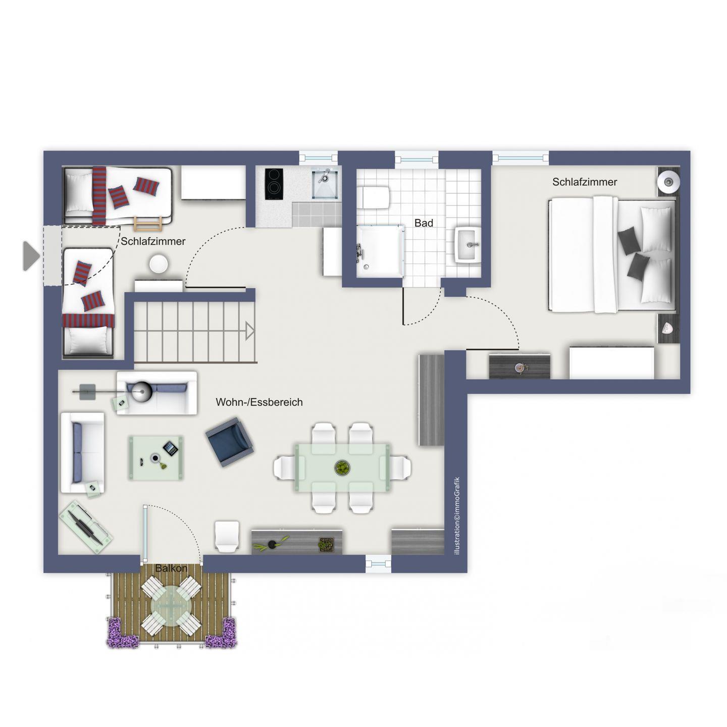 Die Ferienwohnung 07 der Anlage „Auf den Höfen“ ist eine 53 m² große 3-Zimmer-Wohnung für bis zu 5 Personen. Die Wohnung verläuft über zwei Etagen und verfügt über einen Balkon.