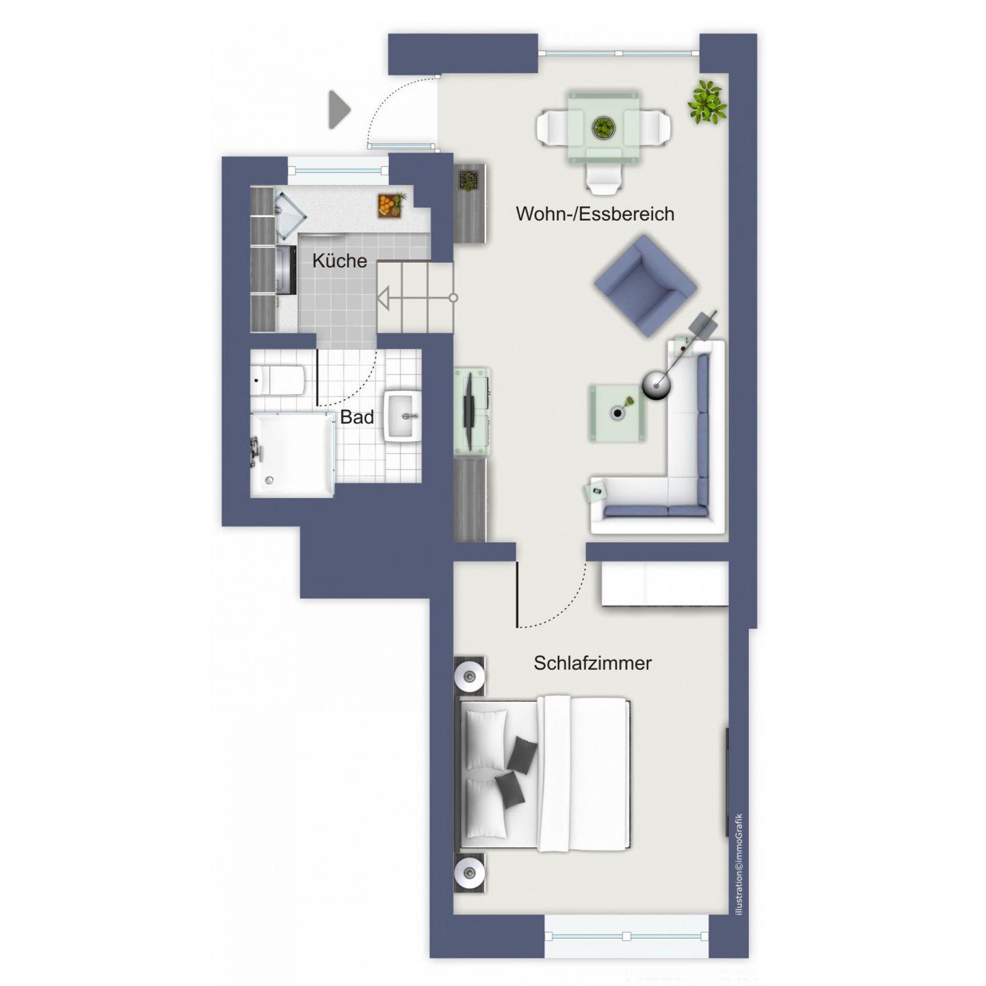 Die gut und modern ausgestattete 33 m² große Wohnung Nr. 3 liegt im Erdgeschoss. Sie verfügt über einen Wohn-/Essbereich, eine Küche, ein Schlafzimmer und ein Duschbad.