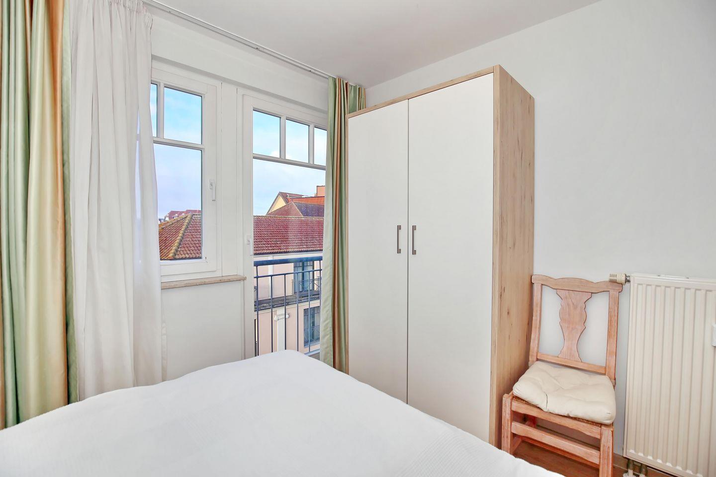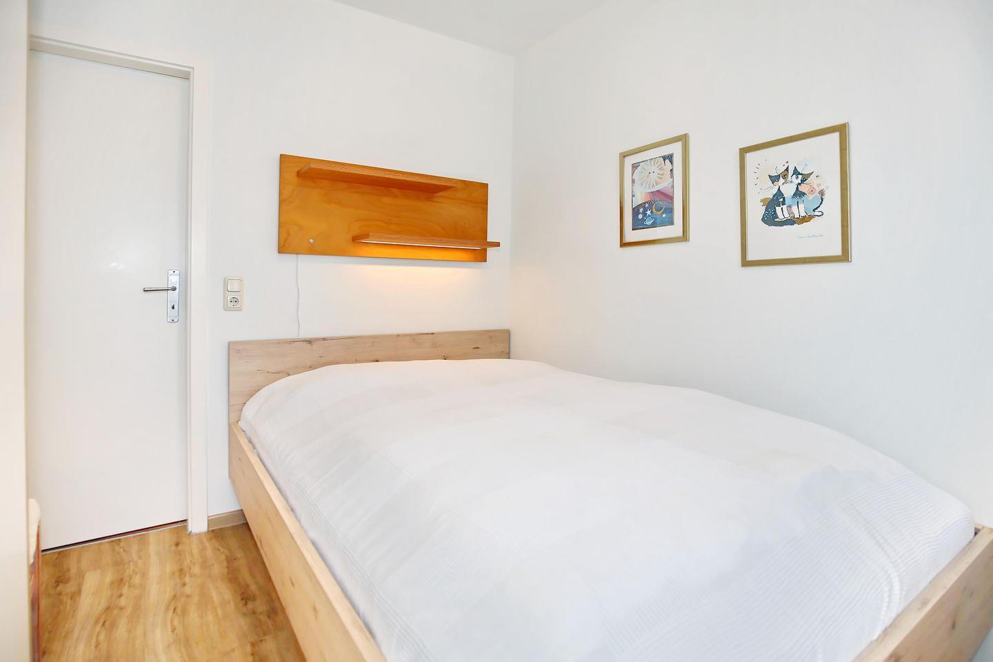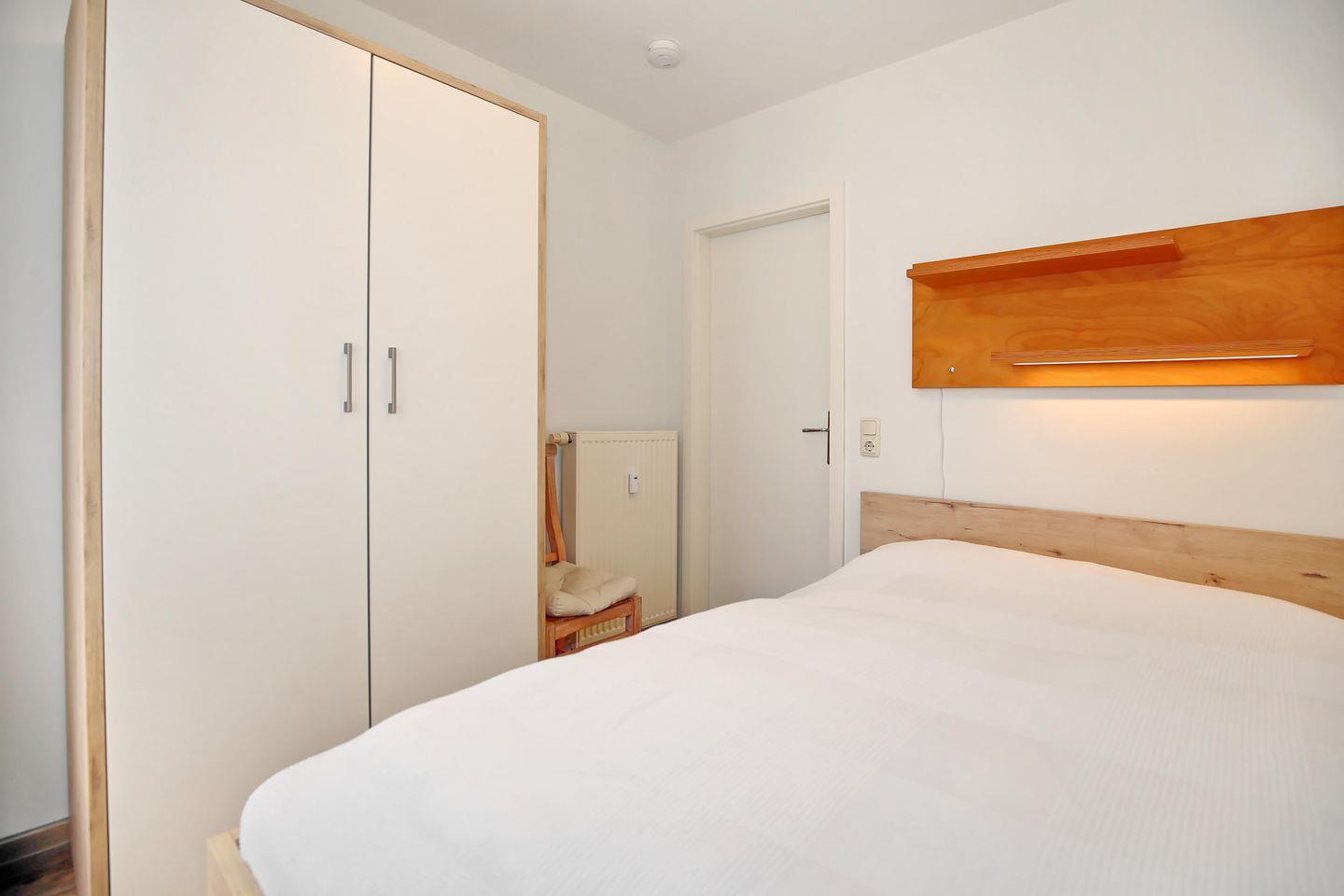 Im zweiten Schlafzimmer steht dir ein Doppelbett (140 x 200 cm) sowie ein Kleiderschrank zur Verfügung. Auch hier hast du einen seitlichen Blick aufs Meer. Vorhänge dienen in beiden Schlafzimmern zum Verdunkeln.