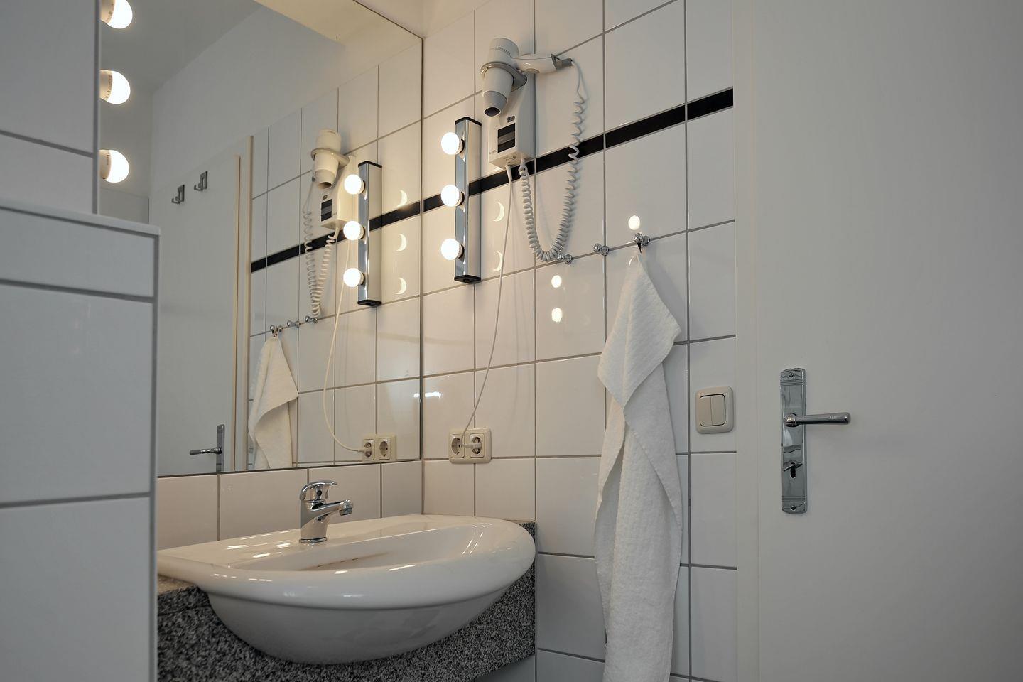 Das Appartement verfügt selbstverständlich auch über ein Duschbad/WC mit Föhn und Kosmetikspiegel.