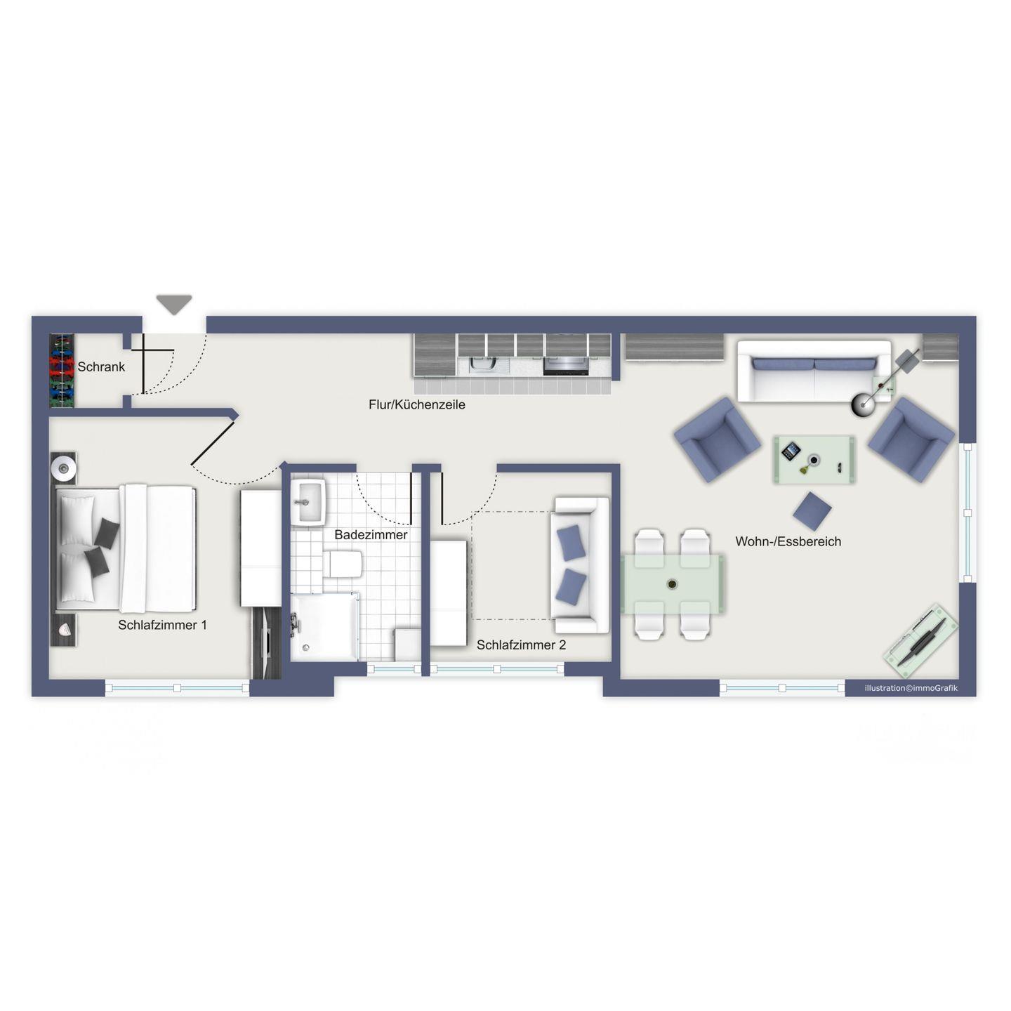 Im ersten Schlafzimmer wurde Teppichboden, im Wohnzimmer und im zweiten Schlafzimmer wurde Laminat verlegt. Der Flur, die Küche und das Bad sind gefliest.
