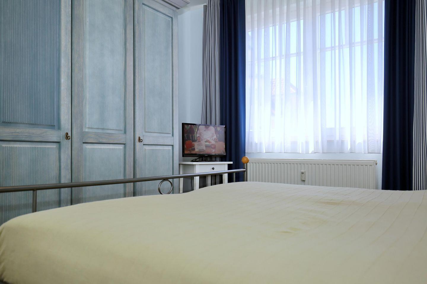 Im ersten Schlafzimmer wurde mit hellen Blautönen gearbeitet. Hier findest du ein bequemes Doppelbett (2 x 90 x 200 cm), einen 2. Flachbild-TV und einen großen Kleiderschrank vor. Du hast vom Schlafzimmer einen seitlichen Meerblick.