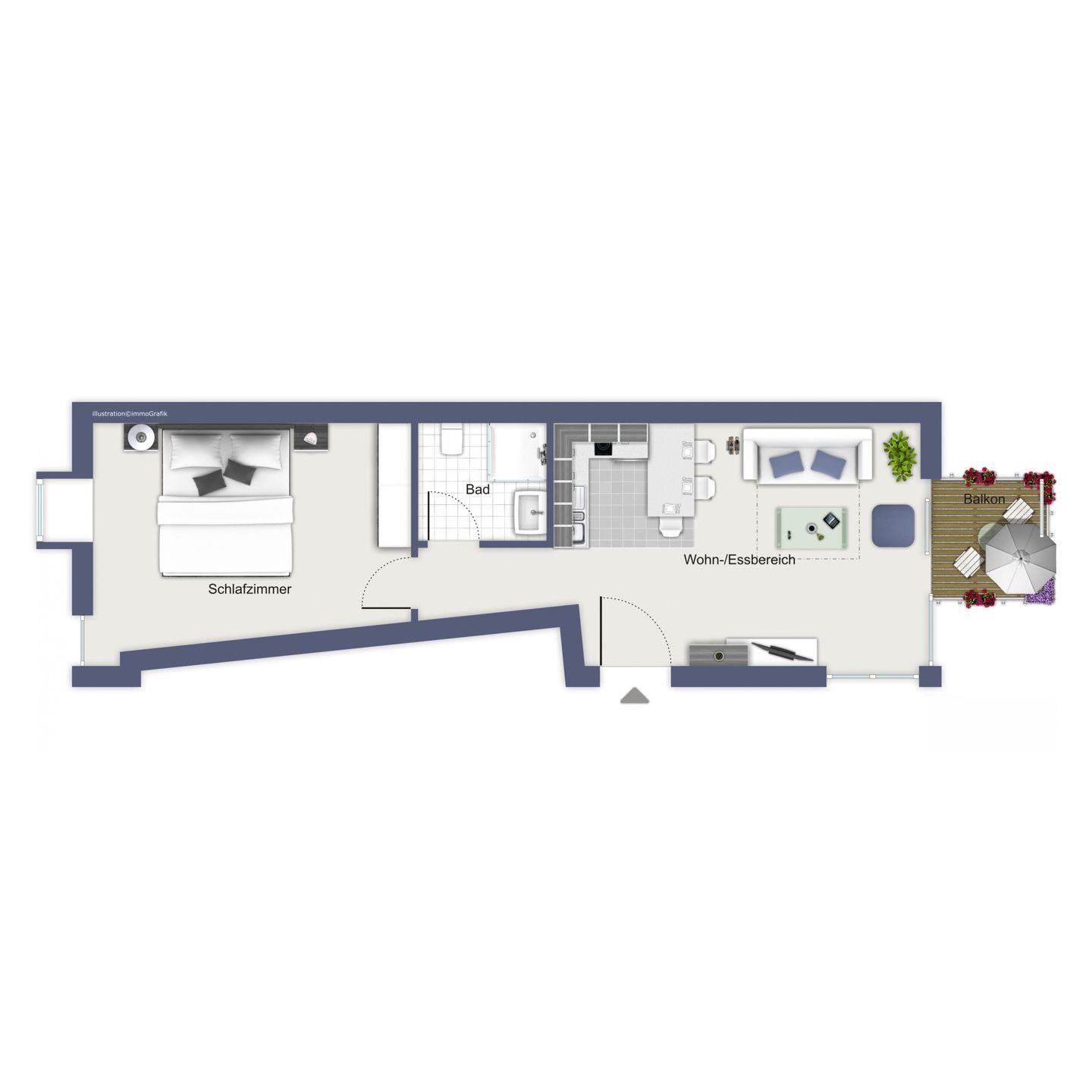 Die Ferienwohnung 06 in der Villa Patricia ist eine 2-Zimmer-Wohnung für bis zu 4 Personen. Die 40 m² große Wohnung liegt im Hochparterre des Hauses und verfügt über einen Balkon zur Südseite. Das Doppelbett ist bereits bezogen.