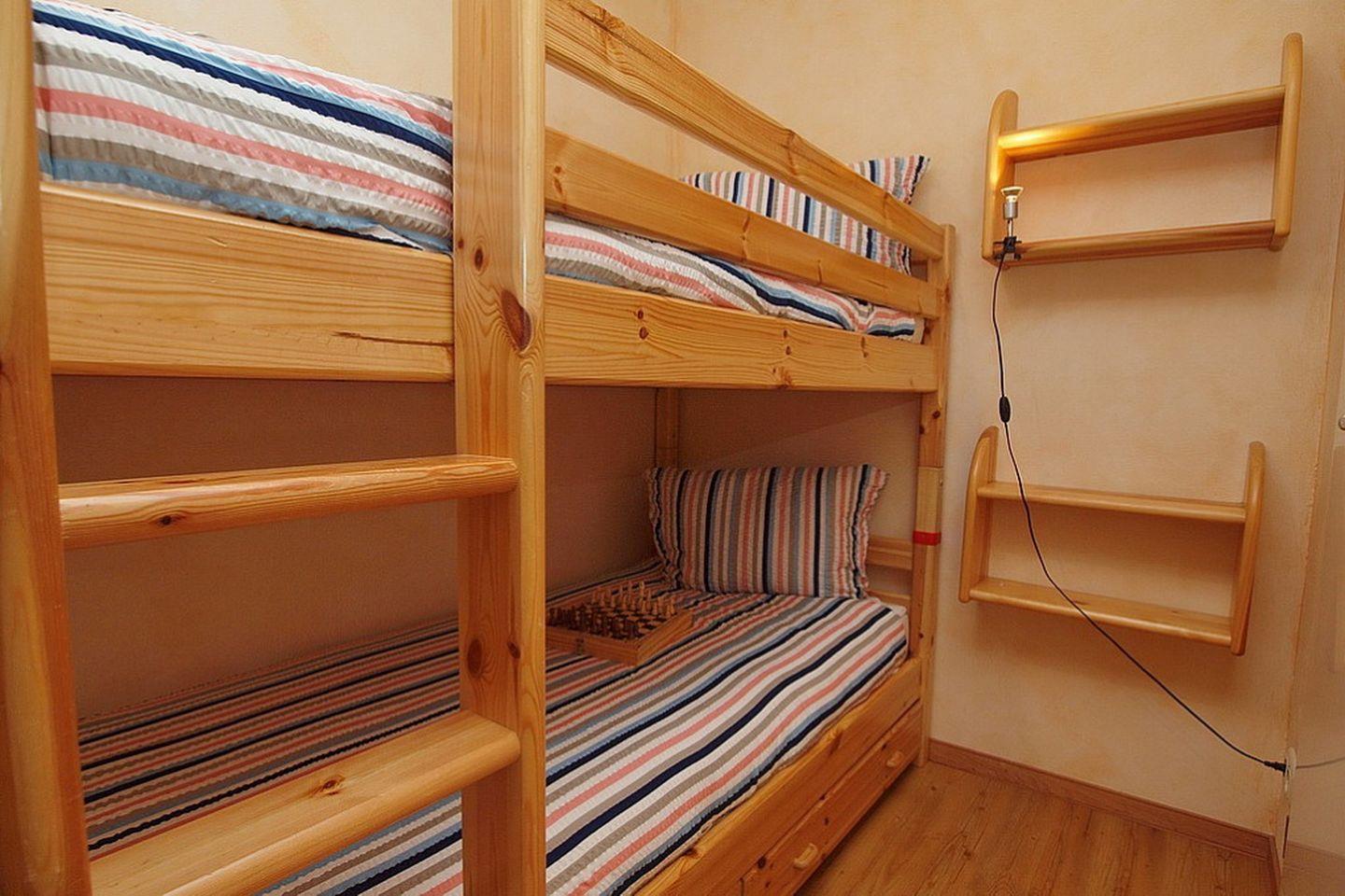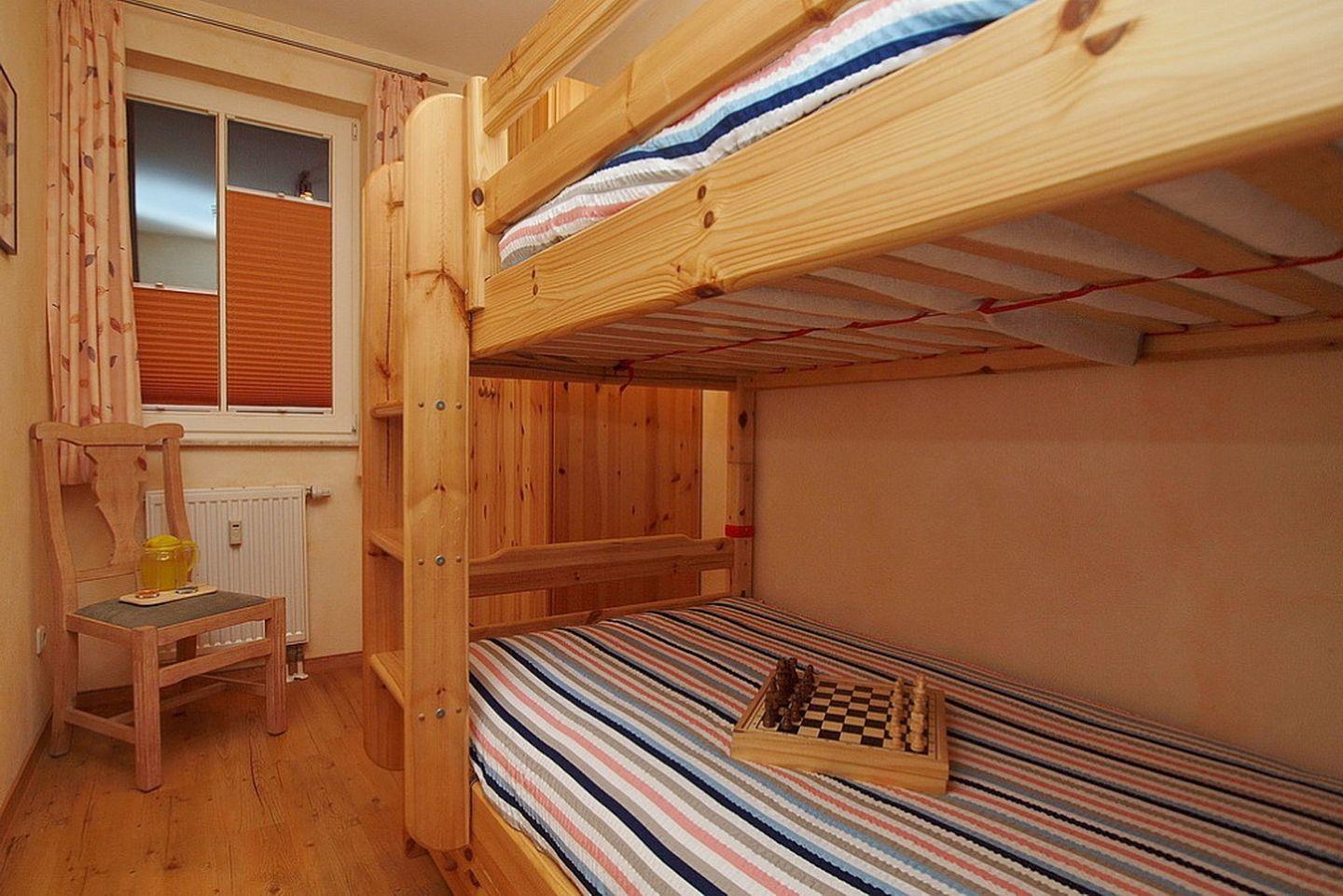 Das zweite Schlafzimmer ist mit einem Etagenbett (90 x 200 cm) ausgestattet und Richtung Atrium gelegen. Für die kleinen Gäste steht weiterhin ein Kinderreisebett zur Verfügung.