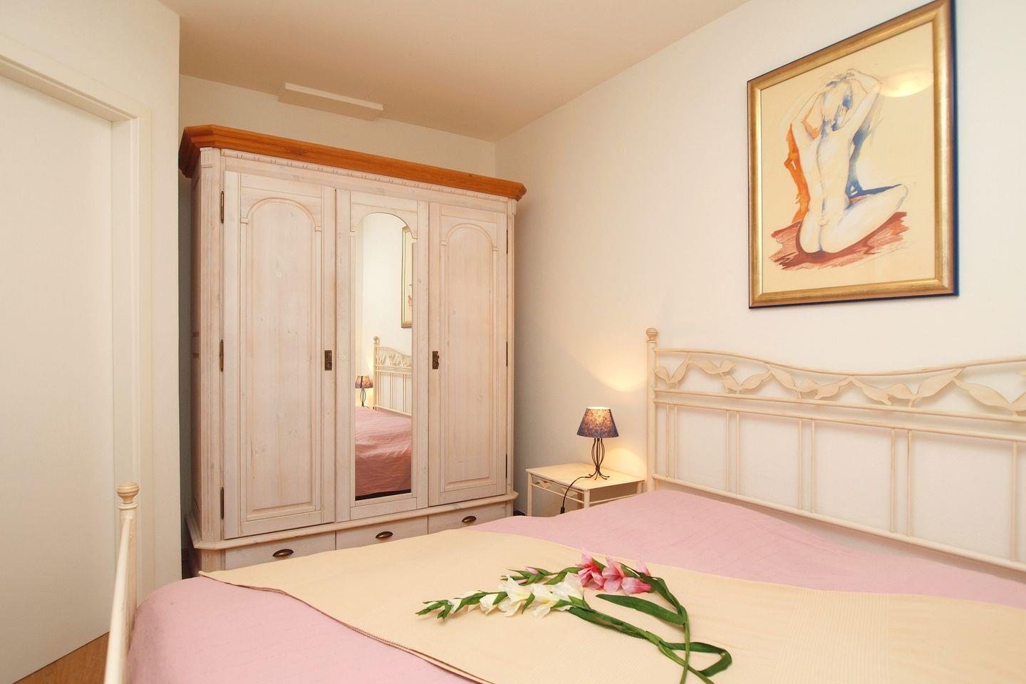 Das Schlafzimmer (das Schlafzimmerfenster geht zum Atrium raus) ist mit hellen Möbeln ausgestattet und bietet ein großes Doppelbett (2 x 90 x 200 cm) sowie einen geräumigen Kleiderschrank. Gardinen und ein Rollo dienen zum Verdunkeln.