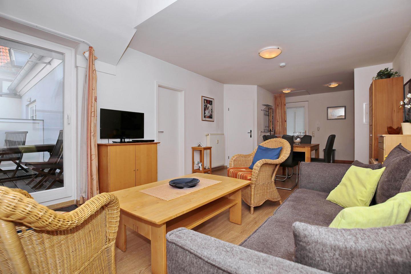 Das Wohnzimmer hält ein bequemes Sofa bereit, welches sich im Nu auch zu einer Schlafcouch (160 x 200 cm) mit 2 Schlafplätzen herrichten lässt. Für Unterhaltung sorgen selbstverständlich auch ein Flachbild-TV und ein DVD-Player.