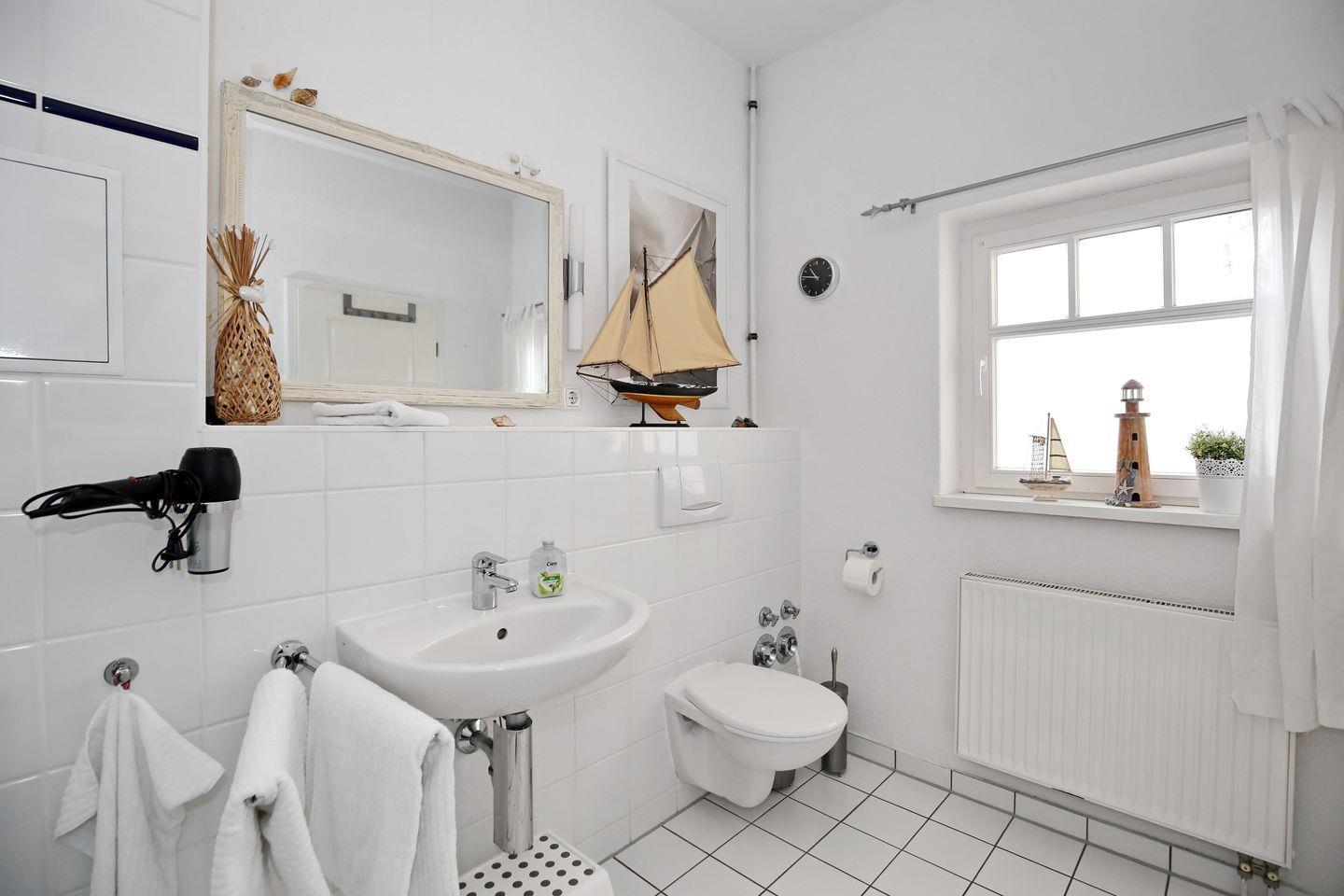 Selbstverständlich gehört ein Badezimmer zur Wohnung. Ein Fön erweitert in dem Tageslichtbad die Grundausstattung von Dusche, WC, Waschbecken, Kosmetikspiegel und Spiegel. Fliesen wurden sowohl im Bad als auch in der Küche verlegt. Die restliche Ferienwohnung verfügt über einen hochwertigen Laminatboden.