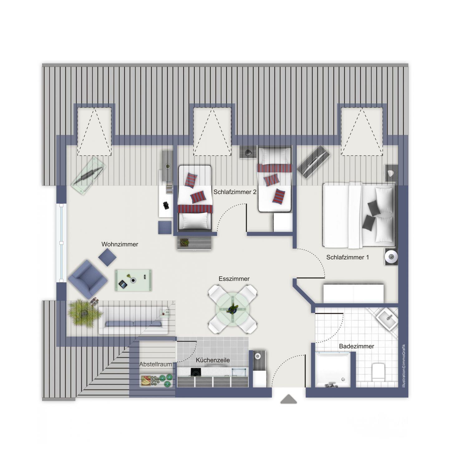 Deine Wohnung liegt im 3. OG und verfügt über eine schöne große, möblierte Dachterrasse (für drei Mietparteien gemeinsam nutzbar). Vom Wohnbereich aus kannst du in den Wintermonaten den Blick auf die Ostsee genießen. Die etwa 50 m² gliedern sich in einen Wohn- und Essbereich, eine Küche sowie ein Duschbad und zwei Schlafzimmer.