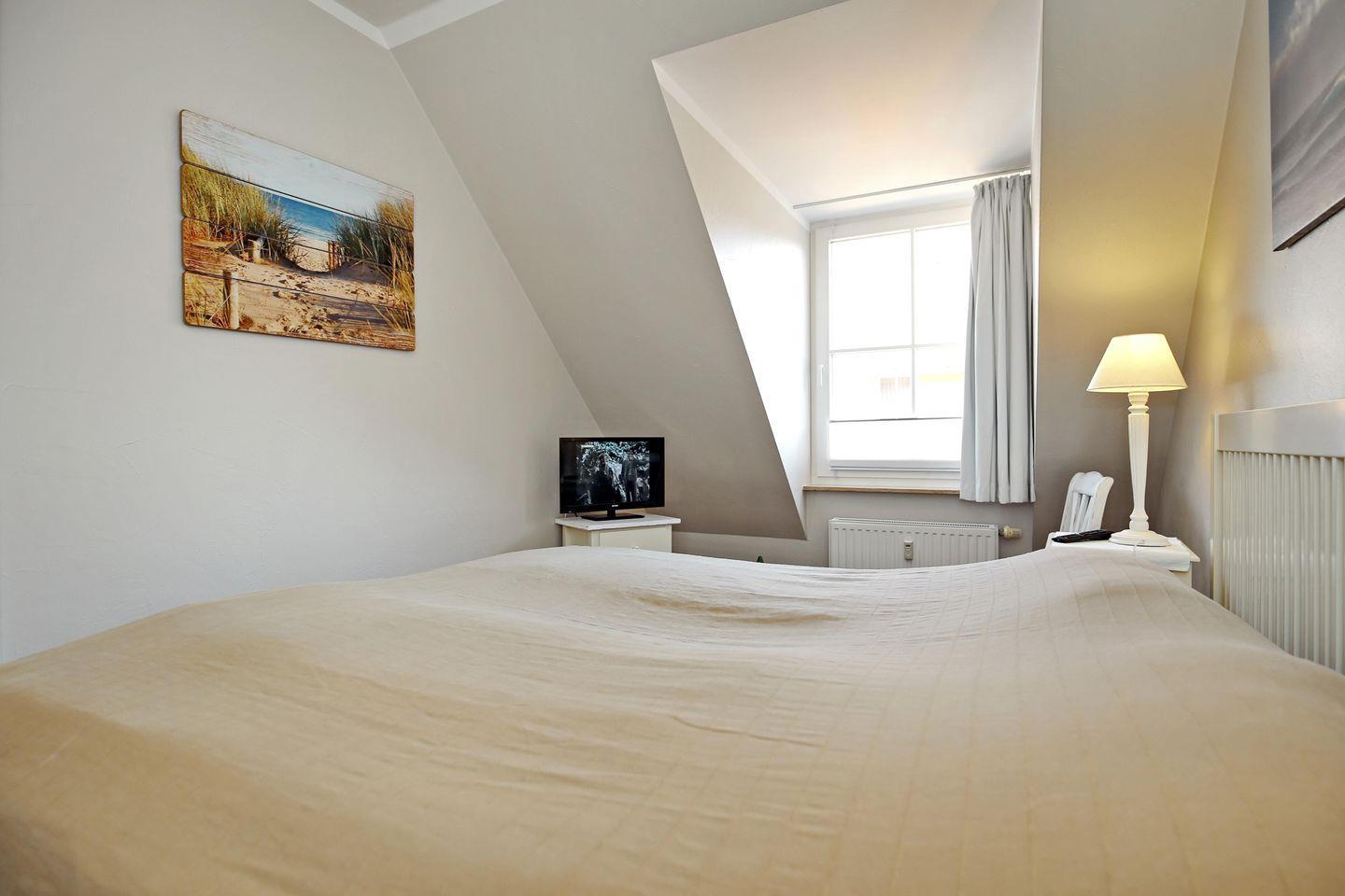 Im ersten Schlafzimmer empfängt dich ein komfortables Doppelbett (2 x 90 x 200 cm) zum erholsamen Schlaf. Ein zweiter TV sorgt hier für abendliche Unterhaltung. Der vorhandene Kleiderschrank bietet dir ausreichend Stauraum für deine Urlaubsgarderobe. Im zweiten Schlafzimmer laden dich 2 Einzelbetten (je 90 x 200 cm) zur Nachtruhe ein. Auch bietet ein Kleiderschrank genügend Platz für dein Gepäck. Vorhänge und Plissees dienen dir in beiden Schlafräumen als Sichtschutz.