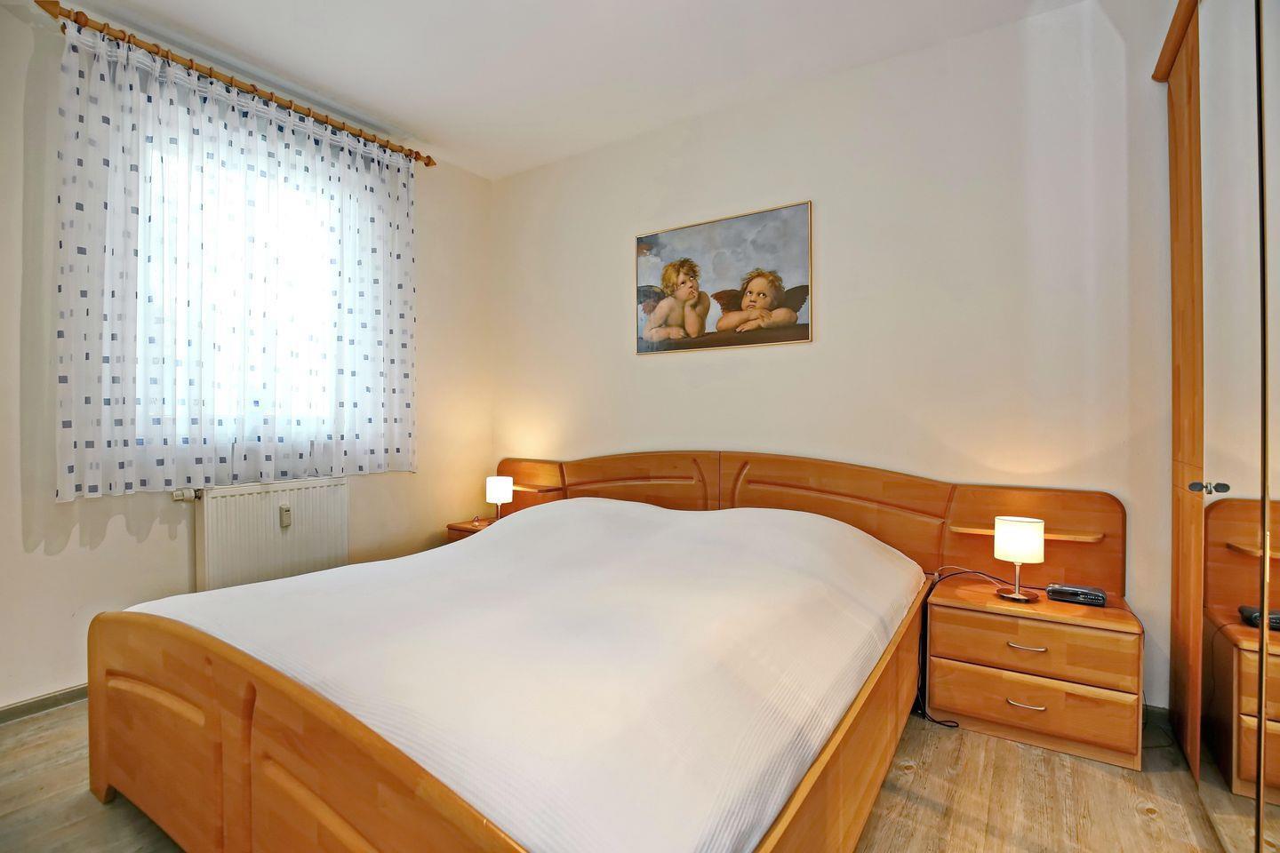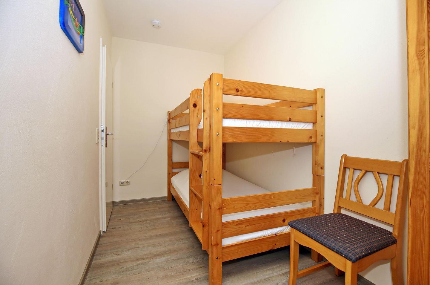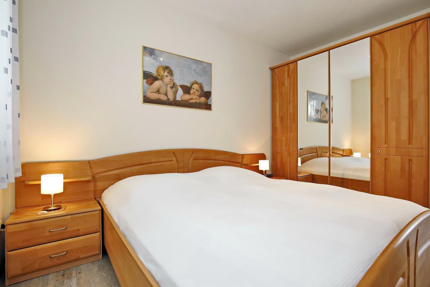 Im ersten Schlafzimmer lädt ein Doppelbett (2 x 90 x 200 cm) zu erholsamem Schlaf ein. Das zweite Schlafzimmer ist mit einem Etagenbett (je 90 x 200 cm) ausgestattet. In beiden Schlafzimmern bieten Kleiderschränke viel Stauraum (die Schlafzimmerfenster beider Zimmer gehen zum Atrium raus).