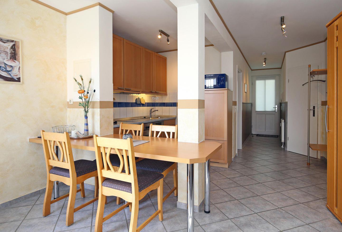 Der angrenzende Küchenbereich ist mit 4 Ceran-Kochfeldern, einem Kühlschrank mit Gefrierfach, einem Backofen, einer Mikrowelle und einem Geschirrspüler ausgestattet. Ein Wasserkocher, eine Kaffeemaschine und ein Toaster komplettieren die Ausstattung der Küche.