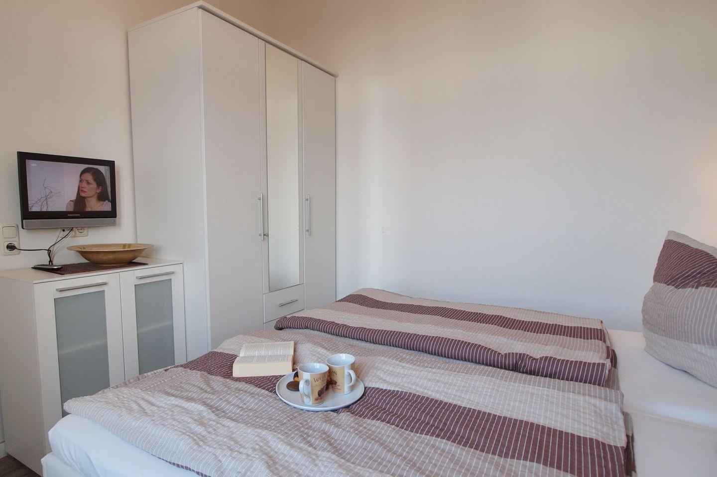 Das behaglich eingerichtete Schlafzimmer sorgt mit dem Doppelbett (180 x 200 cm einteilige Matratze), dem Kleiderschrank, einer Kommode und dem LCD-Fernseher für Entspannung. Gardinen dienen als Verdunkelungsmöglichkeit.