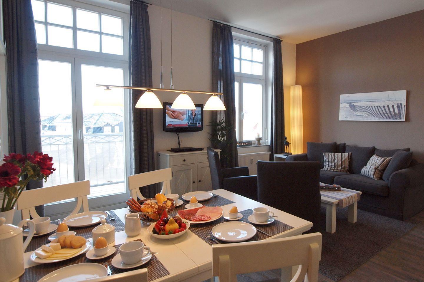 Der Wohnbereich empfängt dich mit einer gemütlichen Sitzgruppe und bietet mit dem Flachbild-Fernseher und der Stereoanlage einen entspannten Tagesausklang.