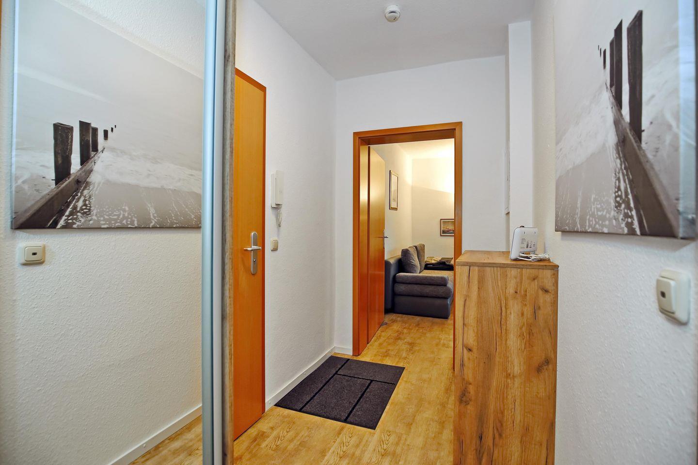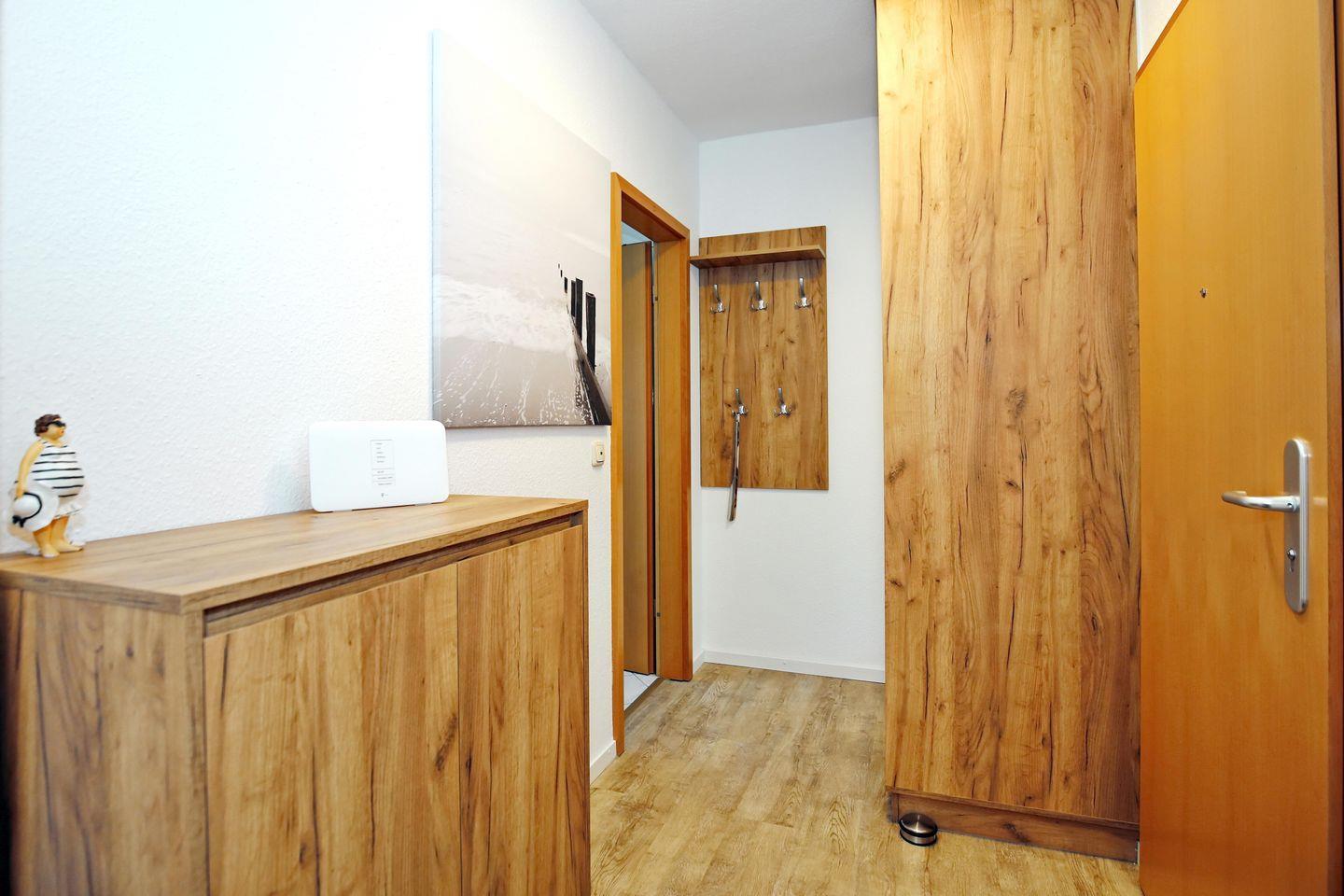 Im Tageslichtbad mit WC erwarten dich eine Dusche (nahezu barrierefrei) sowie ein Schrank, der viel Platz bietet, ein Föhn, ein Spiegelschrank und ein beheizbarer Handtuchhalter. Das Bad und der Küchenbereich sind gefliest. Im Flur und im Wohnbereich ist Designbelag in Eichenoptik verlegt. Im Flur bieten ein Kleiderschrank und eine Kommode viel Stauraum für dein Urlaubsgepäck.