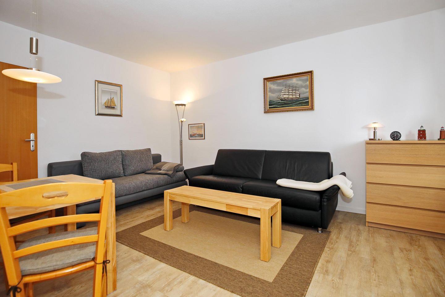 Der Wohnbereich der Ferienwohnung ist mit zwei Couchen und einem Flachbild-TV eingerichtet. Der integrierte Essbereich bietet 2 Personen genügend Platz für gemeinsame Mahlzeiten. Mit wenigen Handgriffen wird für dich aus der Lederschlafcouch (160 x 200 cm) ein bequemer Schlafplatz. Als Sicht- und Sonnenschutz sind alle Fenster mit Plissees versehen.