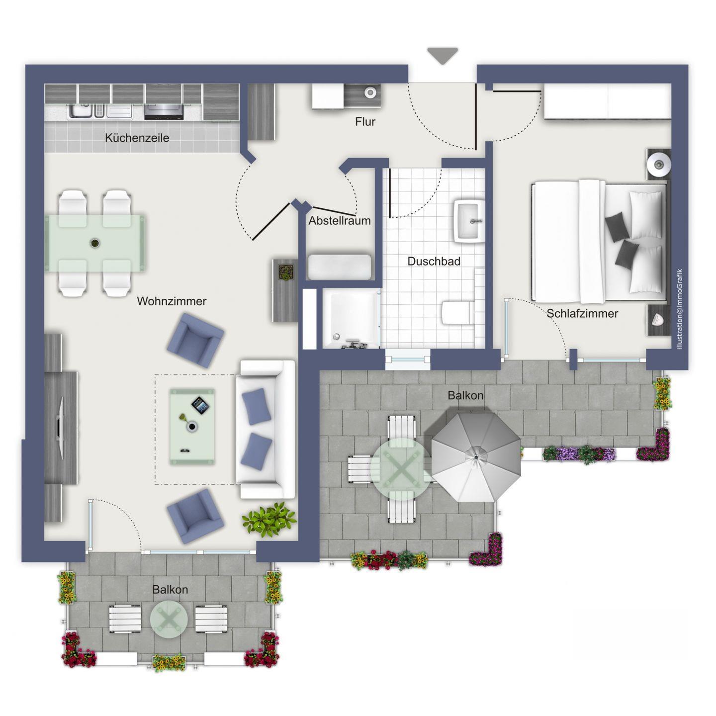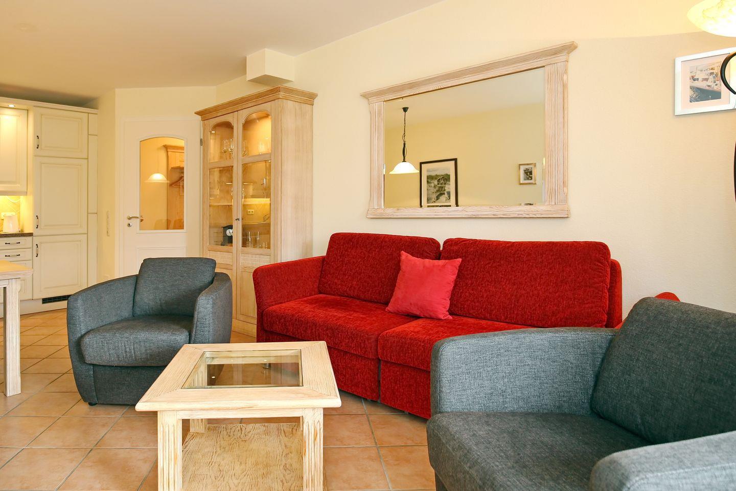 Im offenen Wohnbereich laden dich eine Couch mit zwei Sesseln, ein Flachbild-TV, ein DVD-Player und eine Stereoanlage zu geselligen Abenden ein. Von hier aus gelangst du auf den südlich ausgerichteten Balkon und kannst die Sonnenstunden des Tages genießen. Der integrierte Essbereich ist für 2 Personen großzügig eingerichtet. Außerdem steht dir kostenfreies WLAN zur Verfügung.
