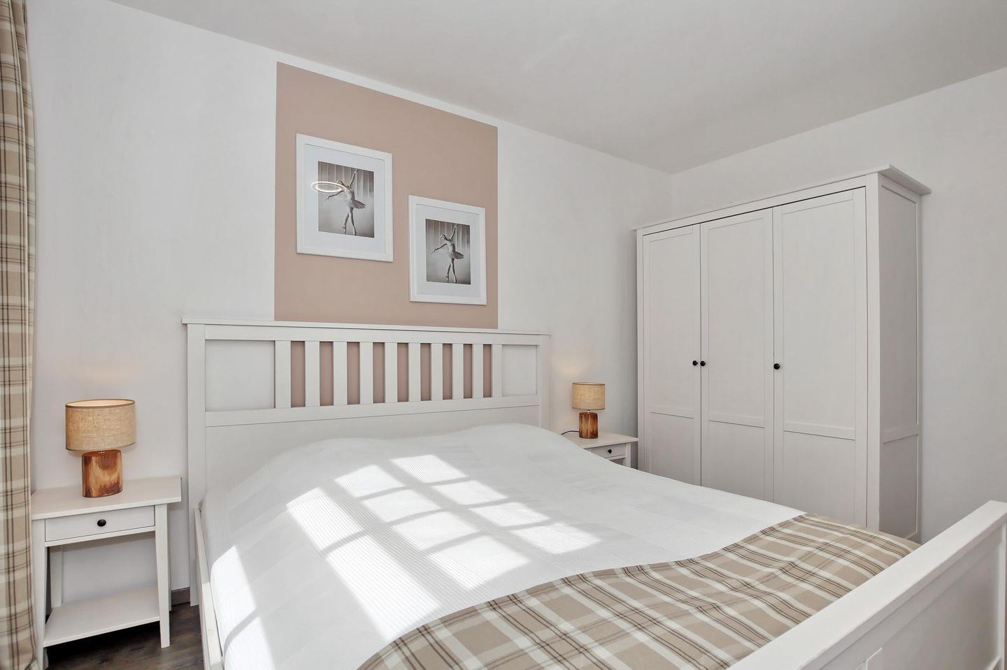 Das Schlafzimmer, welches ebenfalls zur ruhigen Waldseite liegt, bietet dir ein Doppelbett (2 x 90 x 200 cm) für erholsamen Schlaf. Ein 3-türiger Kleiderschrank verfügt über ausreichend Stauraum. Vorhänge und Plissees dienen dir als Sichtschutz oder zum Verdunkeln.