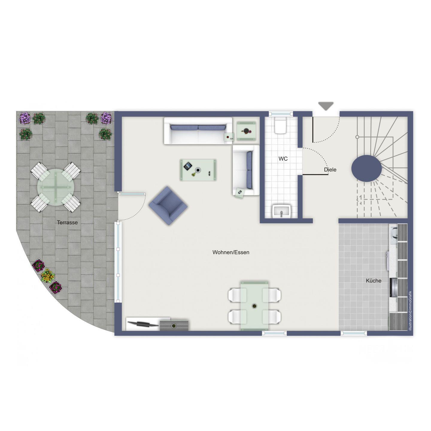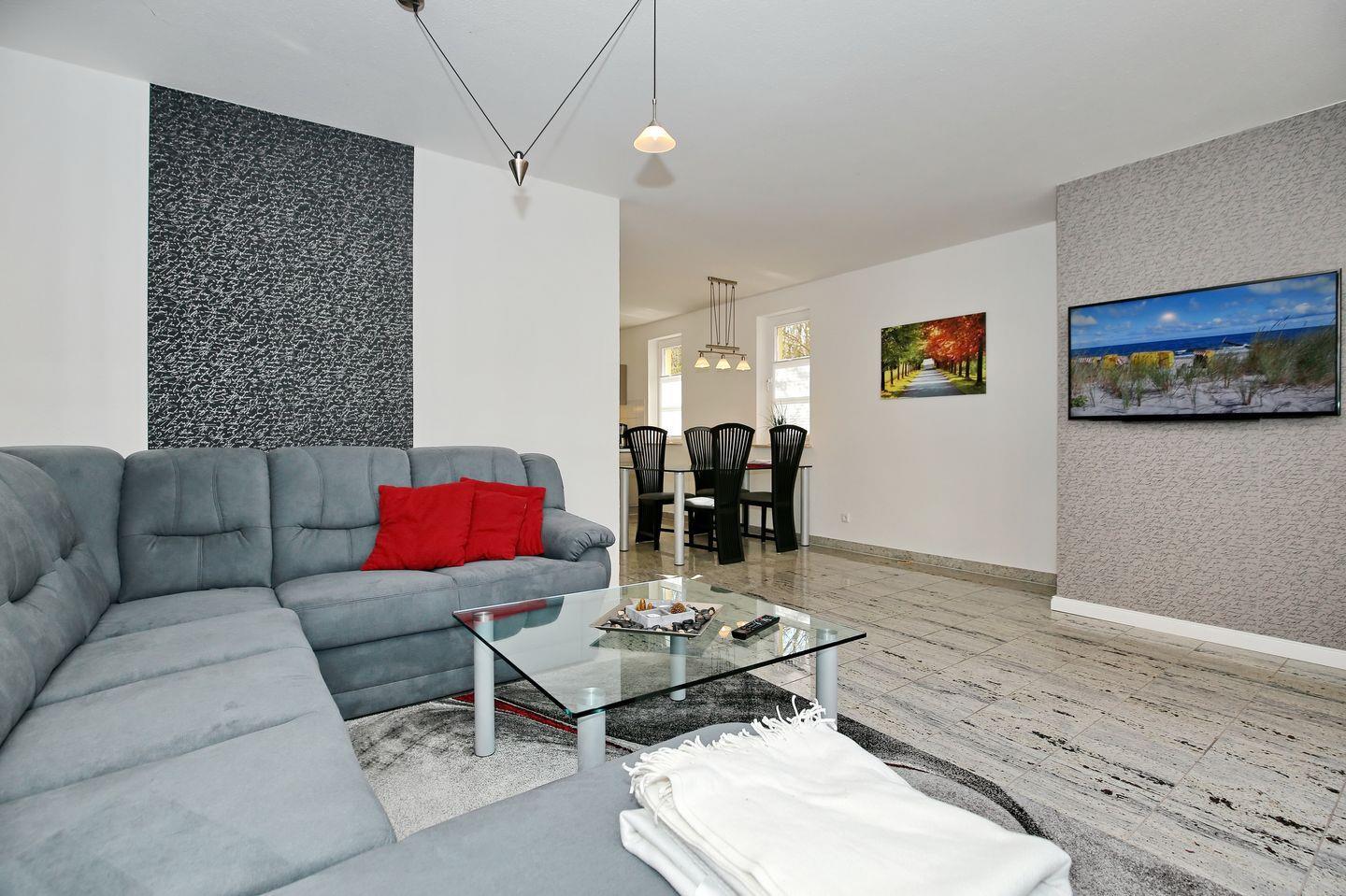 Entspanne auf der großzügigen Sofalandschaft im Wohnbereich. Für Unterhaltung sorgen hier der Flachbild-TV, die Stereo-Anlage und das WLAN (ohne Gewähr). Die Terrasse befindet sich auf der Süd-West-Seite des Hauses und ist vom Wohnzimmer aus zugänglich.