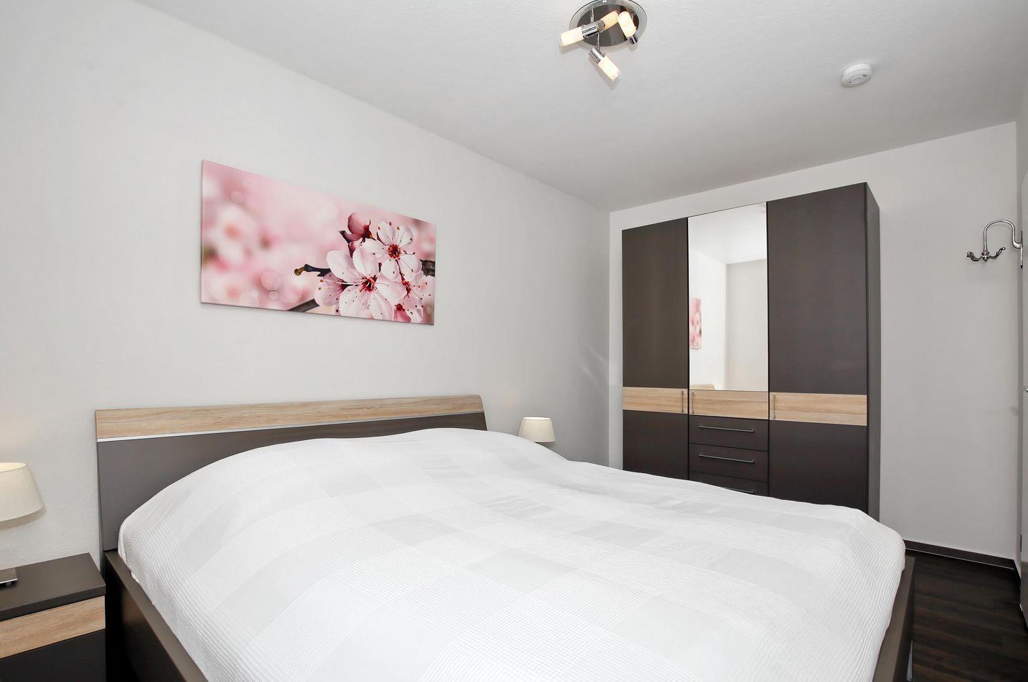 Im Schlafzimmer befindet sich ein Doppelbett (2 x 90 x 200 cm) und ein geräumiger Kleiderschrank. Vorhänge dienen als Sichtschutz oder zum Verdunkeln.