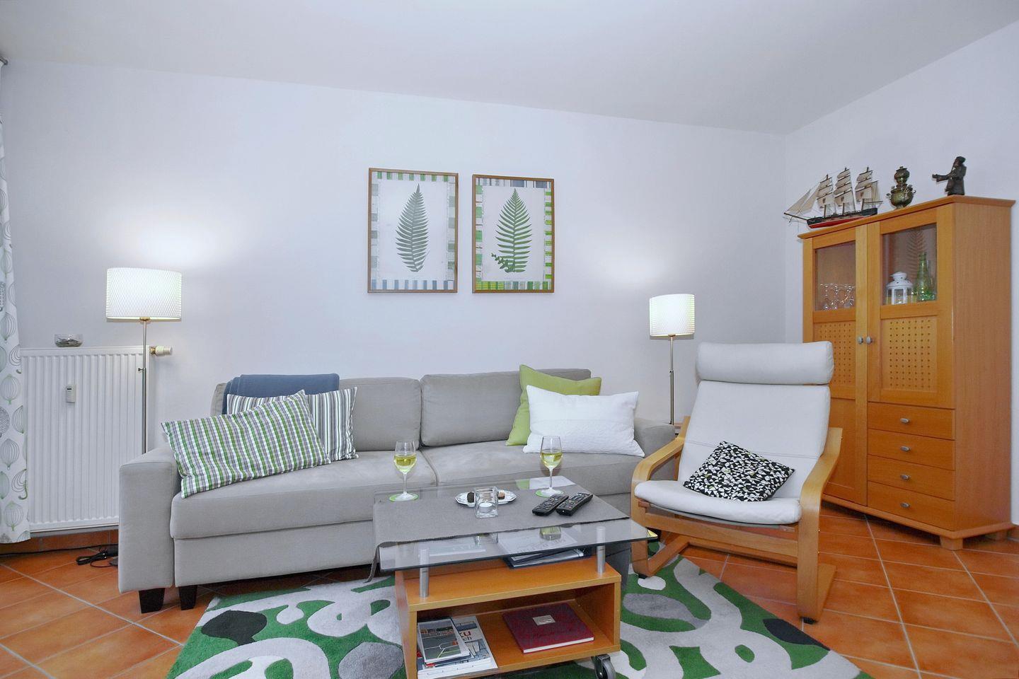 Im großzügigen Wohnraum der Ferienwohnung laden ein bequemes Schlafsofa (140 cm x 200 cm) und 1 Schwingsessel zu gemütlichen Fernsehabenden mit einem modernen Flachbild-TV und einem Blu-Ray-Player ein. Für Ihren Aufenthalt steht Ihnen kostenfreien WLAN (ohne Gewähr) zur Verfügung. Durch das Schlafsofa ist eine Aufbettung auf 3 Personen möglich. Der Essbereich bietet genügend Platz zum Verweilen. Ein Internetradio steht zur Verfügung.