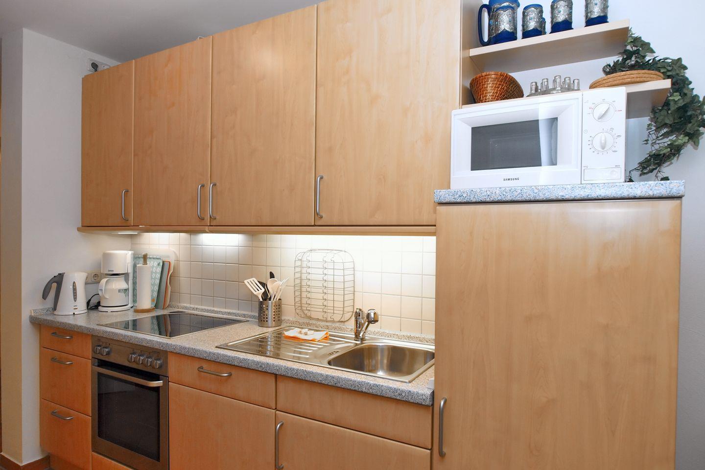 Die angrenzende Küchenzeile ist mit einem Kühlschrank mit Gefrierfach, einem Geschirrspüler, einem 4-Cerankochfeld, Backofen und einer Mikrowelle voll ausgestattet. Natürlich stehen Ihnen ein Toaster, eine Kaffeemaschine, eine Espressomaschine (Tchibo Caffisimo) und ein Wasserkocher zur Verfügung.