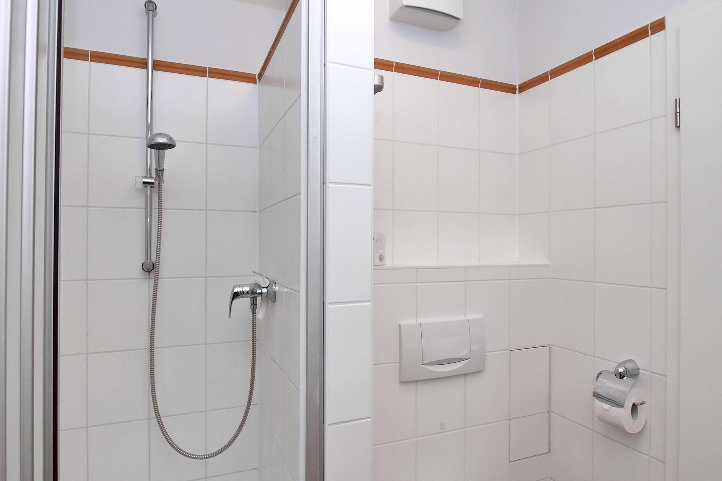 Die Ferienwohnung verfügt über ein gefliestes Duschbad mit WC. Für Ihre Waschutensilien finden Sie genügend Platz auf dem großzügigen Waschtisch. Ein Föhn und ein Kosmetikspiegel komplettieren die Ausstattung des Bades. Im gesamten Wohn- und Schlafbereich sowie im Flur wurden Fliesen verlegt. In dieser Nichtraucherwohnung sind Haustiere nicht erlaubt.