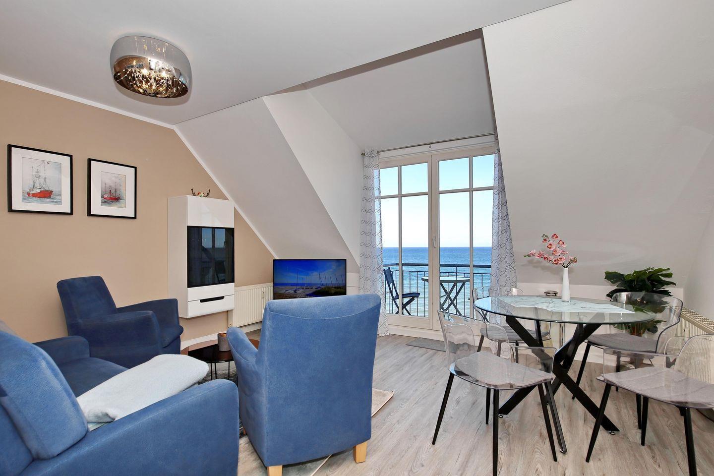 Das Apartment Nr. 515 in der Ferienanlage Meeresblick ist eine 3-Zimmer-Wohnung für bis zu 4 Personen. Die Wohnung liegt in der 5. Etage auf der Nordseite des Hauses und verläuft über 2 Etagen. Der Balkon bietet einen wunderschönen Blick auf die Ostsee.