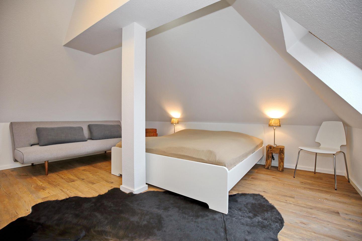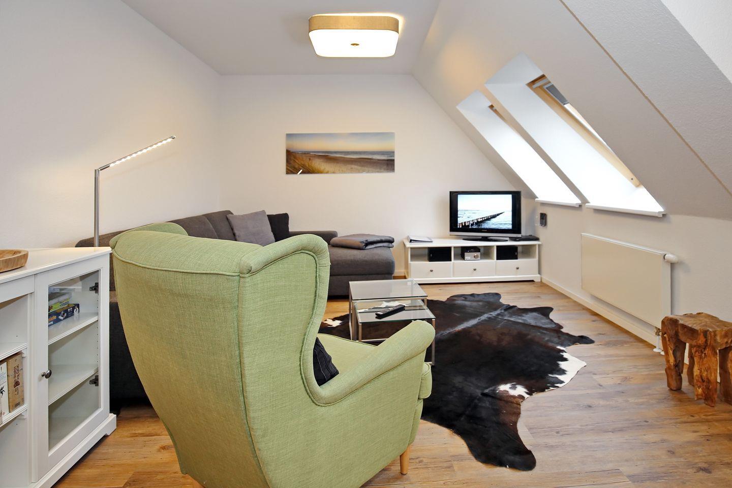 Das zweite Schlafzimmer empfängt dich mit einem Doppelbett (2 x 80 x 200 cm), einem geräumigen Kleiderschrank, einer Kommode und einem Flatscreen-TV. Auch hier bietet ein Schlafsofa einen Schlafplatz (119 x 200 cm) für eine weitere Person. Die höheren und damit schwerer erreichbaren Dachfenster im Obergeschoss sind automatisiert zu öffnen und zu verdunkeln.