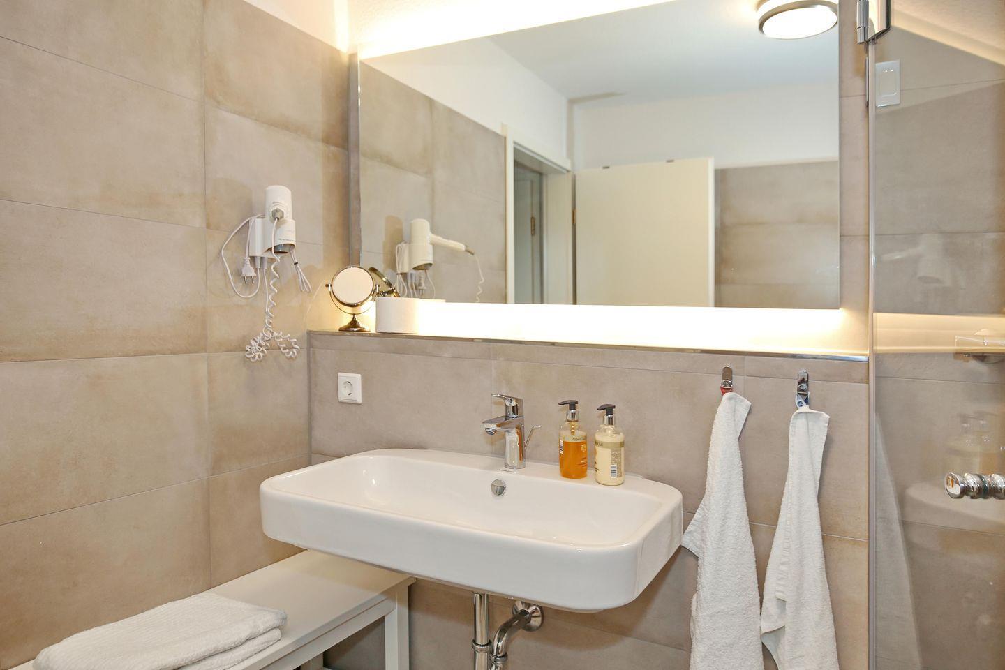 Das Bad in der unteren Etage verfügt über eine bodentiefe Dusche, ein WC sowie ein Waschbecken. Der große beleuchtete Wandspiegel sorgt für ein angenehmes Licht. Zum Trocknen und Aufhängen deiner Handtücher ist eine Wandheizung vorhanden. Ein Föhn sowie ein Hocker für die kleinen Gäste komplettieren das Bad.