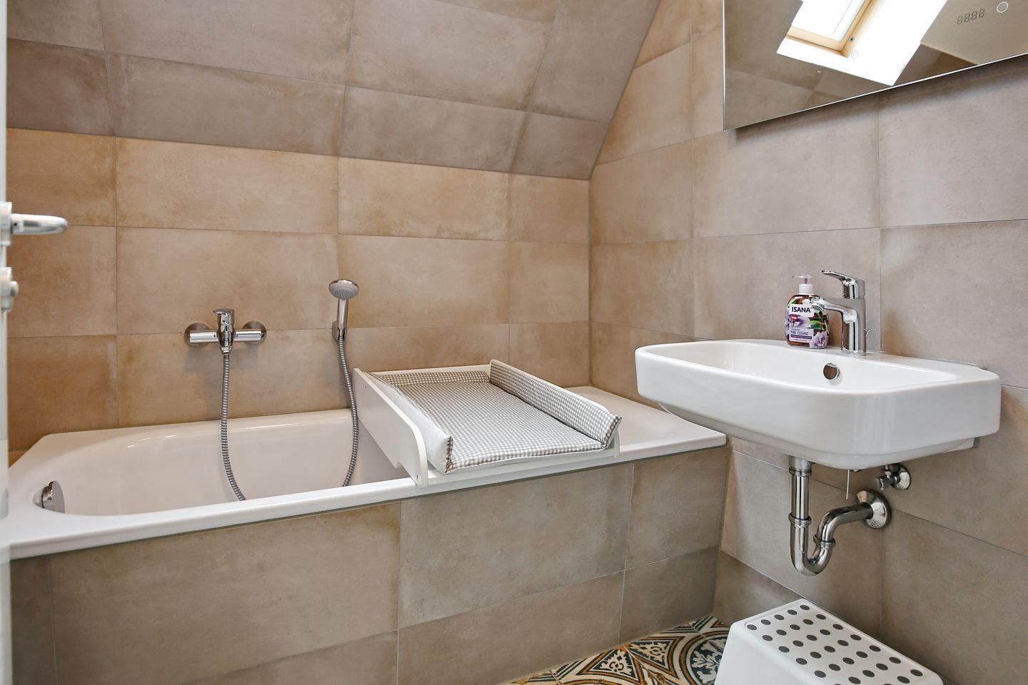 Das Bad im Dachgeschoss erwartet dich mit einer schönen Badewanne, einem WC, einem Waschbecken und einem großen, beleuchteten Spiegel. Für die Kleinen ist auch hier ein Hocker vorhanden, damit diese das Waschbecken ohne Hilfe nutzen können. Im Schrank gegenüber vom Bad wurde ein mobiler Wickeltisch zur Badewannenauflage untergebracht.