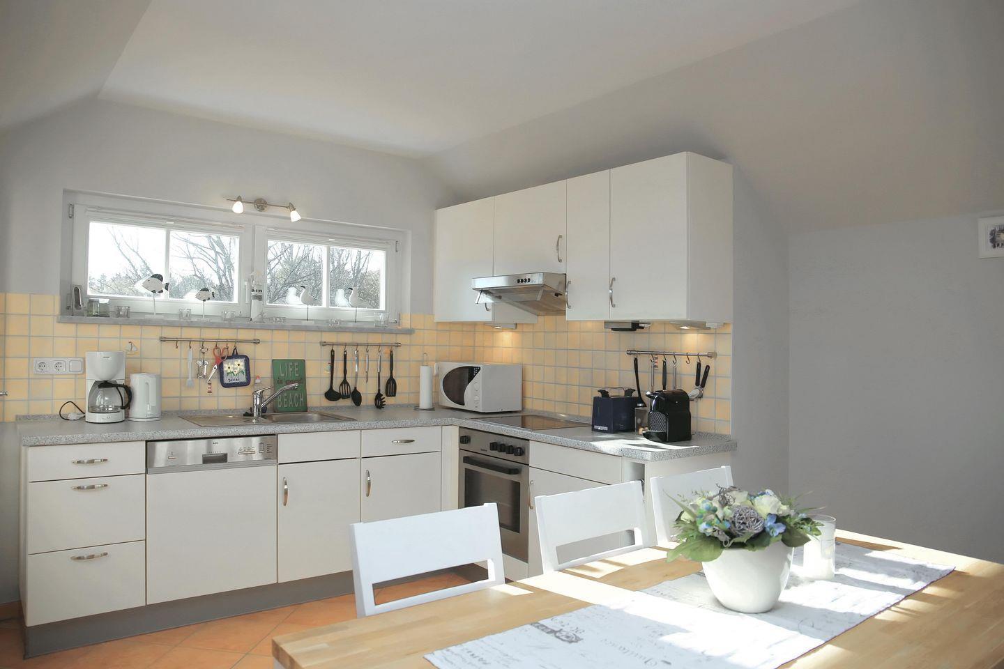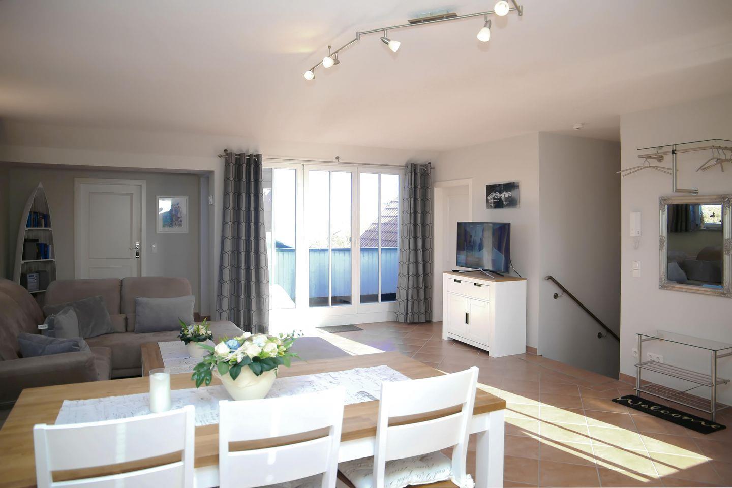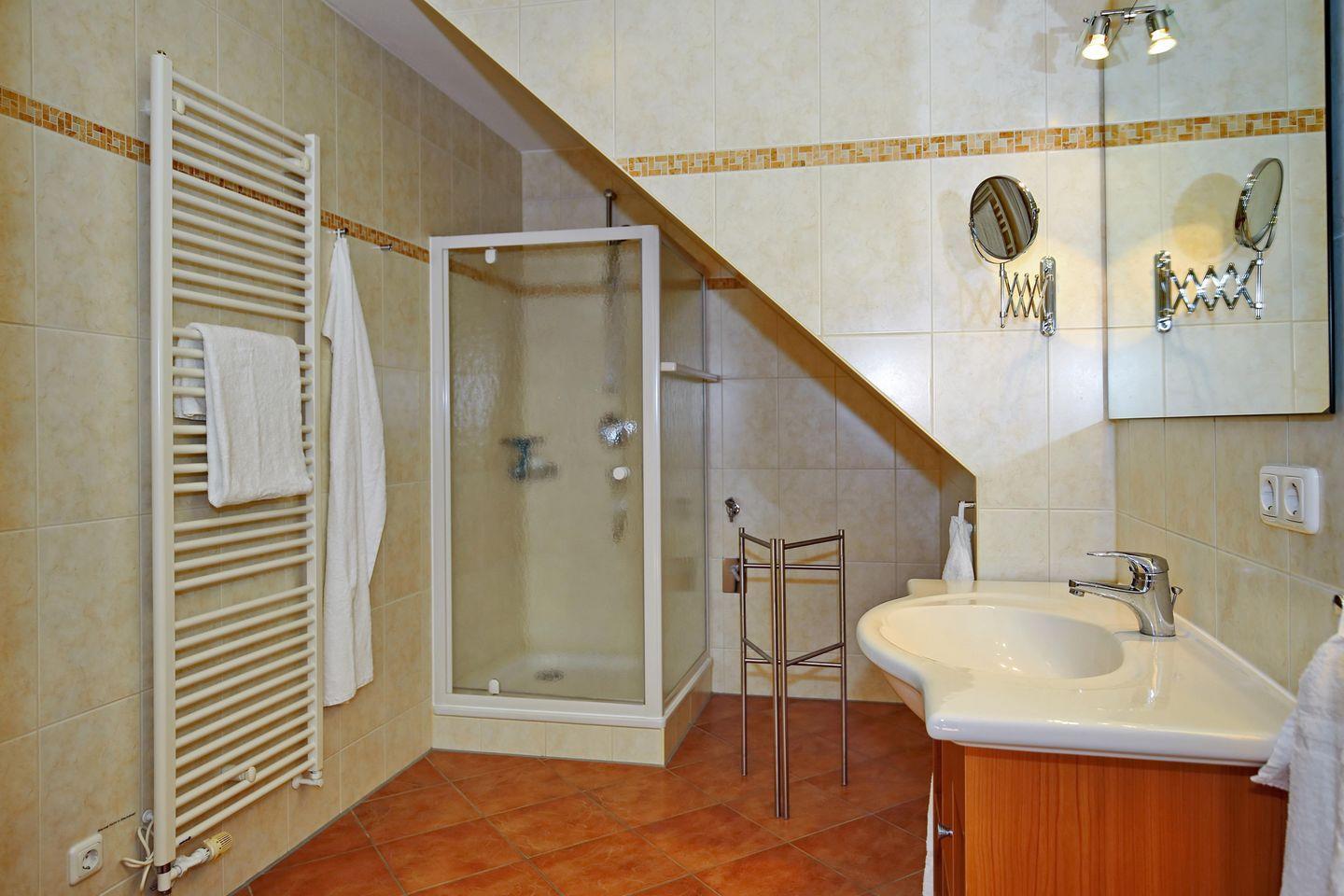 Das Bad verfügt über eine Dusche und ein WC. In der gesamten Ferienwohnung sind Feinsteinfliesen verlegt. In dieser Nichtraucherwohnung ist ein Hund erlaubt.